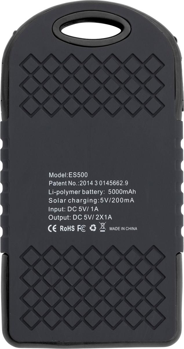 Power Bank solar de caucho y ABS con luces indicadoras verdes y linterna en el lateral. 4.000 mAh. Dos puertos USB y un puerto micro USB. Carga solar 5V / 200mA. Entrada DC 5V / 1A. Salida DC 5V / 2x1A. Incluye cable USB.