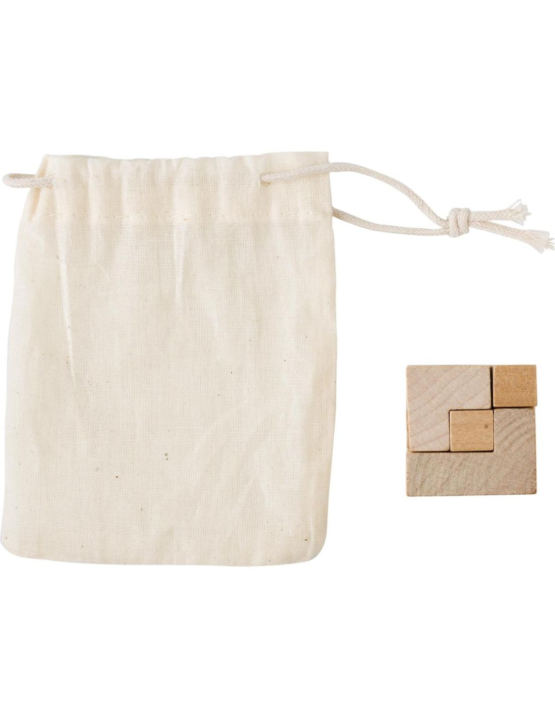 Juego de rompecabezas con cubos de madera. Presentado en una bolsa de algodón.