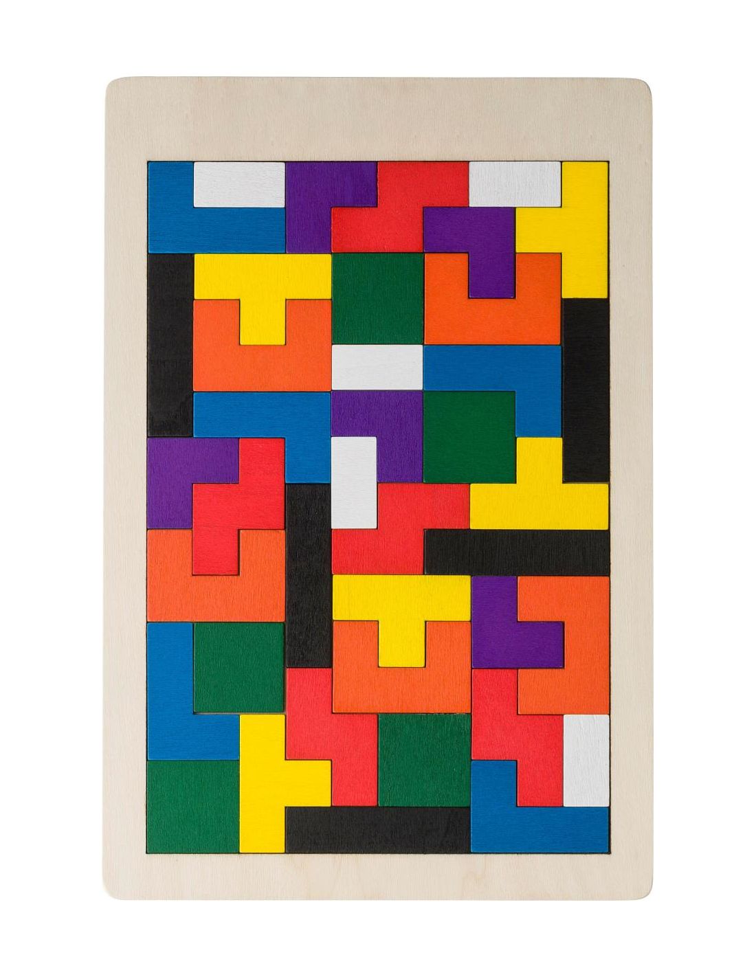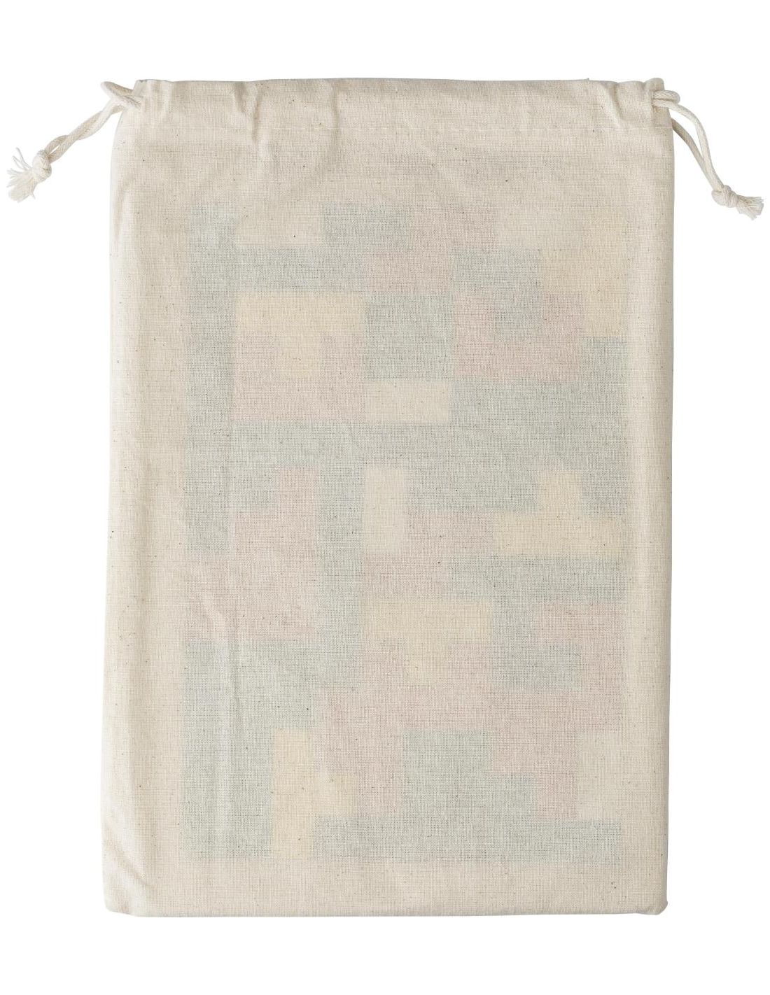 Juego de rompecabezas con 40 piezas de madera presentado en una bolsa de algodón con cordón.