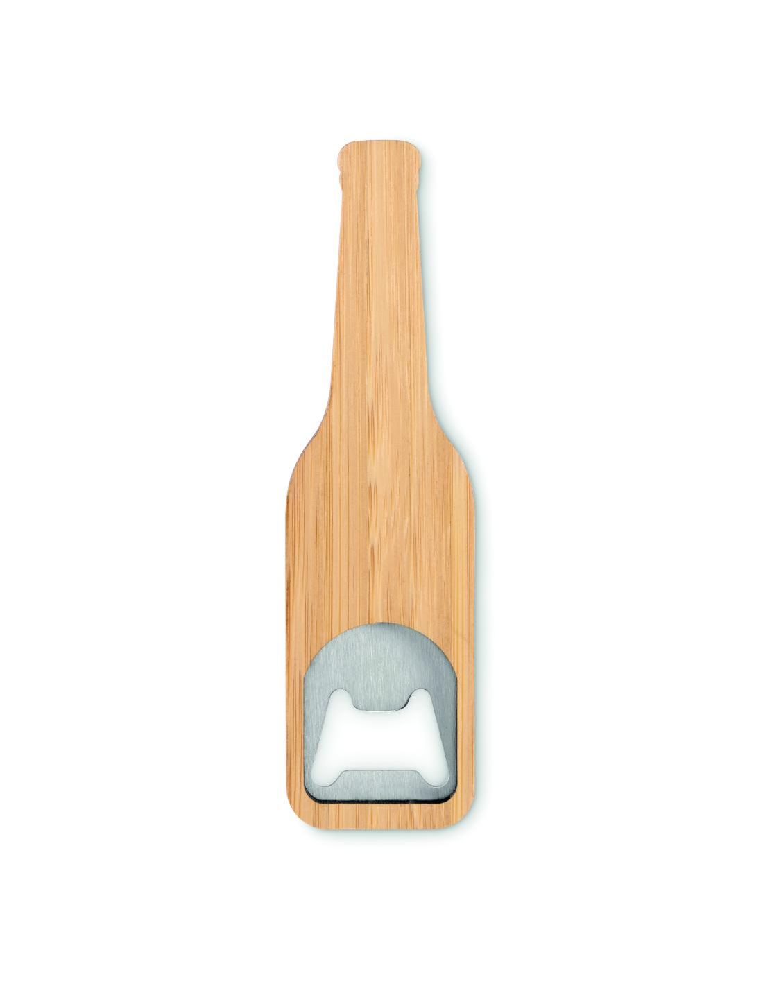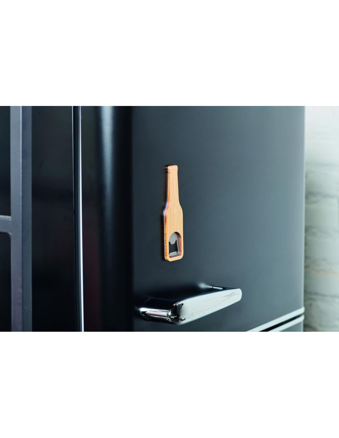 Abrebotellas magnético de acero inoxidable con superficie de bambú.