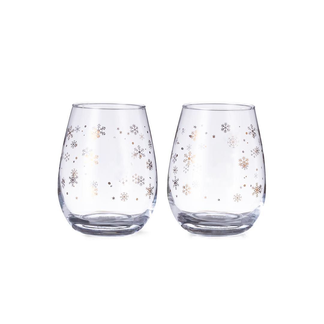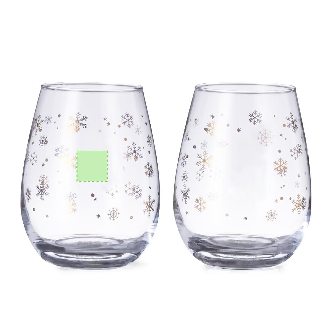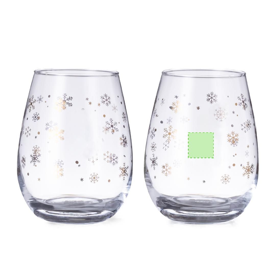 Set de 2 vasos con original diseño de copos de nieve y 500ml de capacidad. Fabricados en cristal, con área de marcaje especial en el frontal. Presentado en caja de diseño en color negro con ilustración en color dorado.
