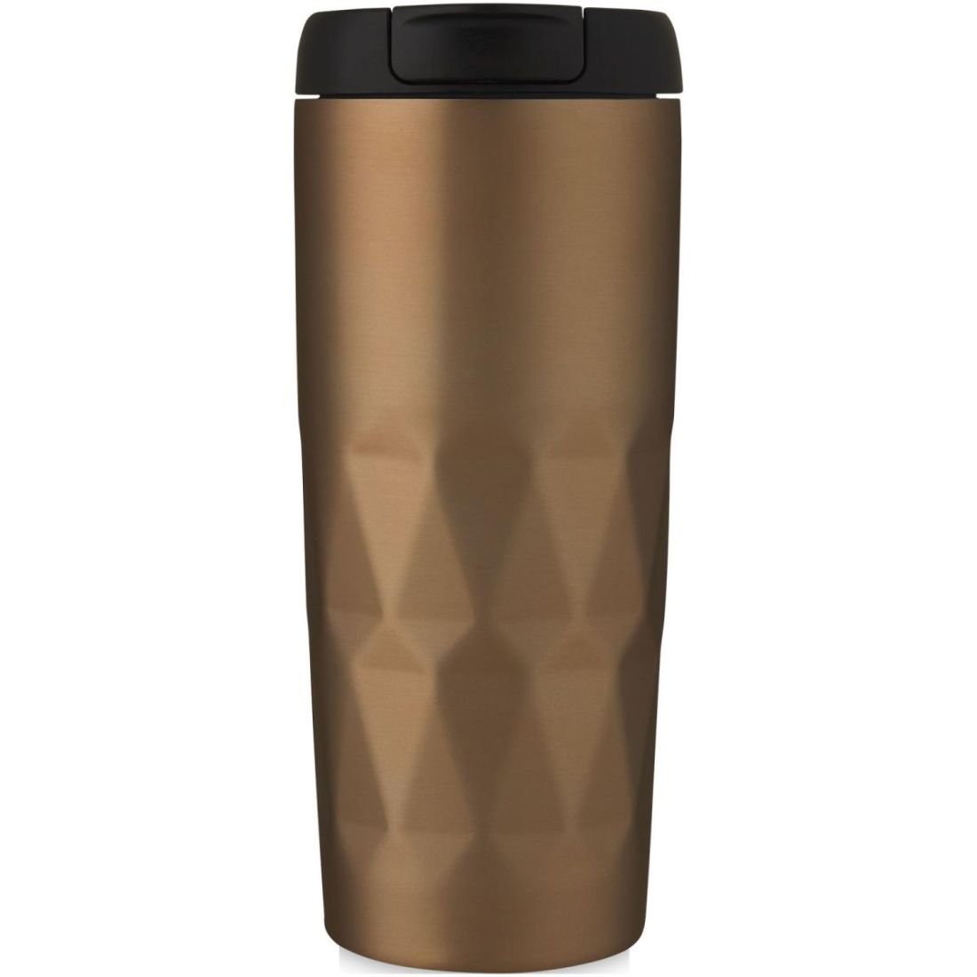Vaso con aislamiento al vacío de cobre de doble pared con tapa de rosca a prueba de fugas y diseño geométrico intrincado. El acero inoxidable 18/8 con aislamiento mantiene las bebidas calientes o frías durante varias horas. No contiene BPA y se ha probado y homologado según la legislación alemana sobre seguridad alimentaria (LFGB), y se ha comprobado el contenido de ftalatos según la normativa REACH. Capacidad de 450 ml. Se recomienda lavarla a mano. Se presenta en una caja de regalo de cartón reciclado.