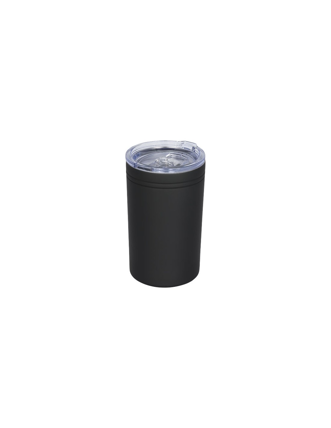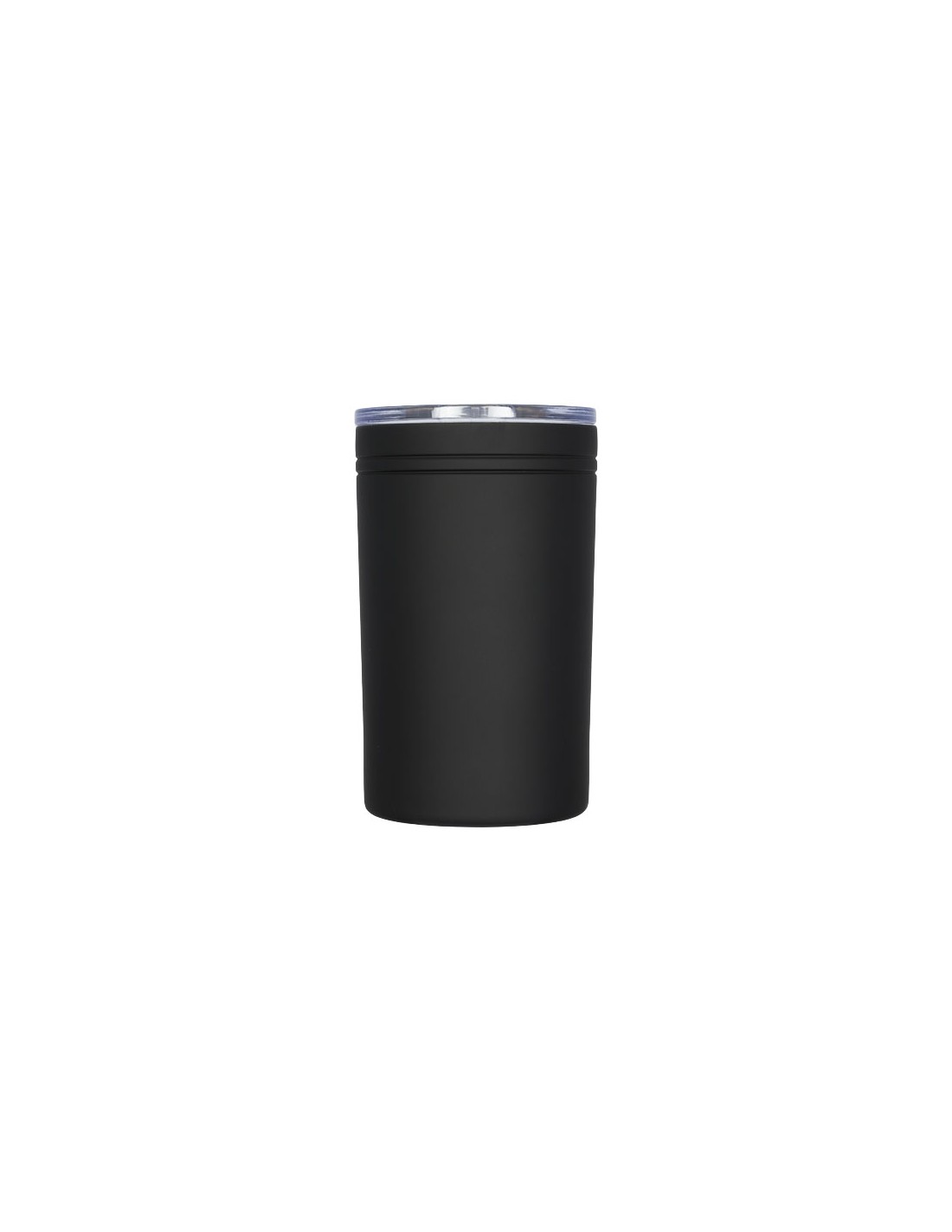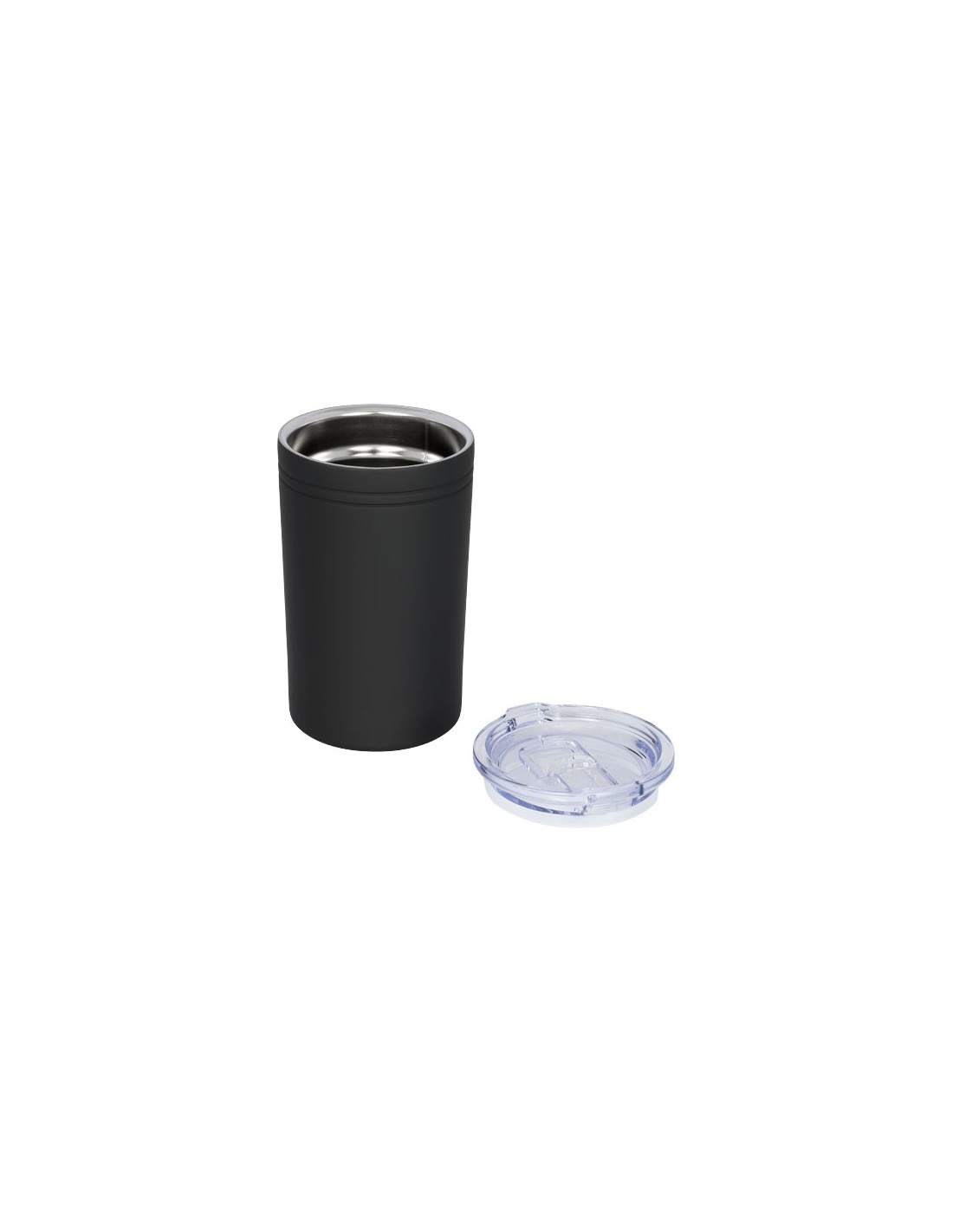 Vaso de construcción de doble pared aislada al vacío. Tapa de presión transparente con cierre deslizante. Funciona como vaso o aislante de bebidas. Capacidad en volumen 330 ml.