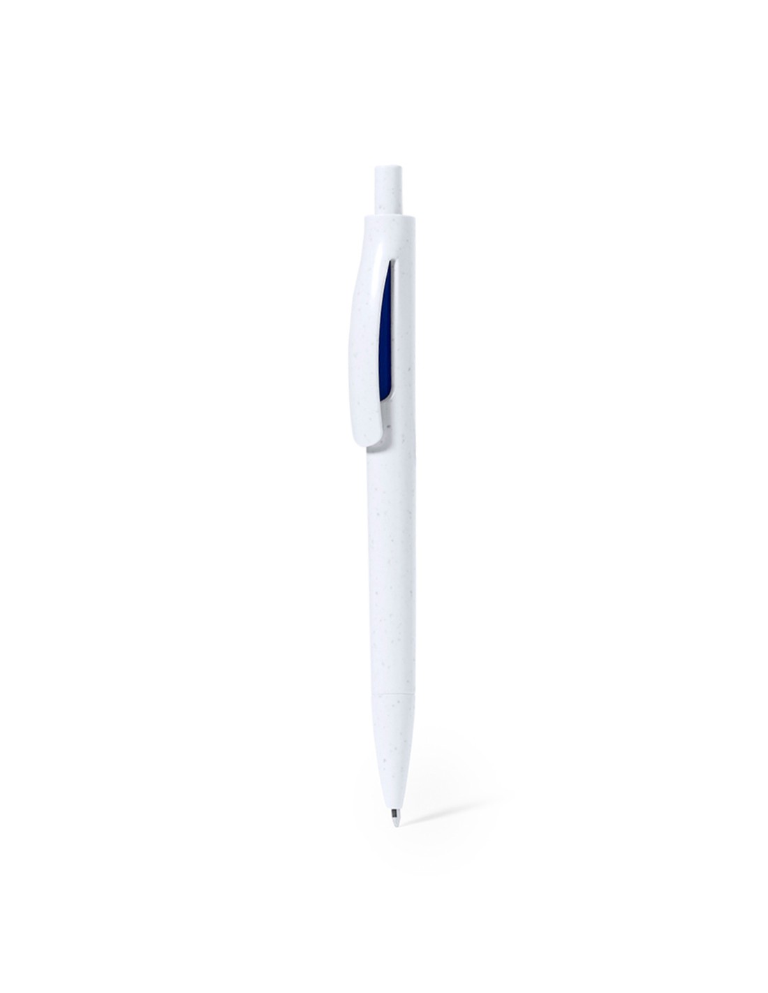 Bolígrafo de mecanismo pulsador fabricado en ABS reciclado. Con accesorios en vivos colores y cuerpo de suave acabado en color blanco sólido. Distintivo ABS reciclado en la parte superior del bolígrafo. En tinta azul.