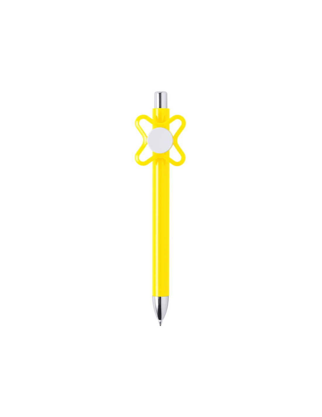 Original bolígrafo spinner antiestrés de mecanismo pulsador y divertido diseño con accesorios en color plateado y cuerpo de acabado sólido en colores brillantes. Especialmente diseñado para tampografía en clip y en cuerpo. De cartucho jumbo y en tinta azul.