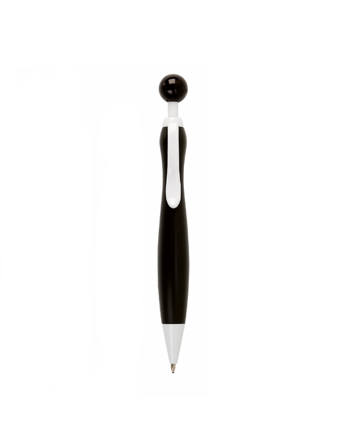 Bolígrafo de mecanismo pulsador de atrevido diseño bicolor con accesorios en color blanco sólido y cuerpo curvado de suave acabado en llamativos colores sólidos. Con original clip pulsador en forma de bola a juego. De cartucho jumbo y tinta azul.