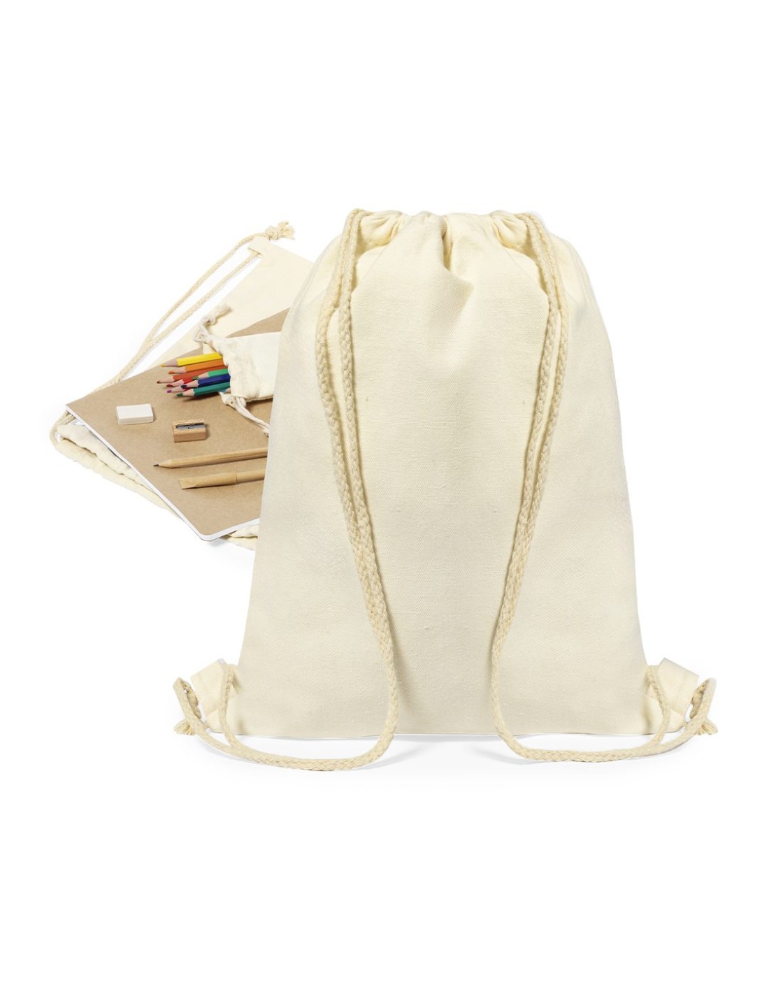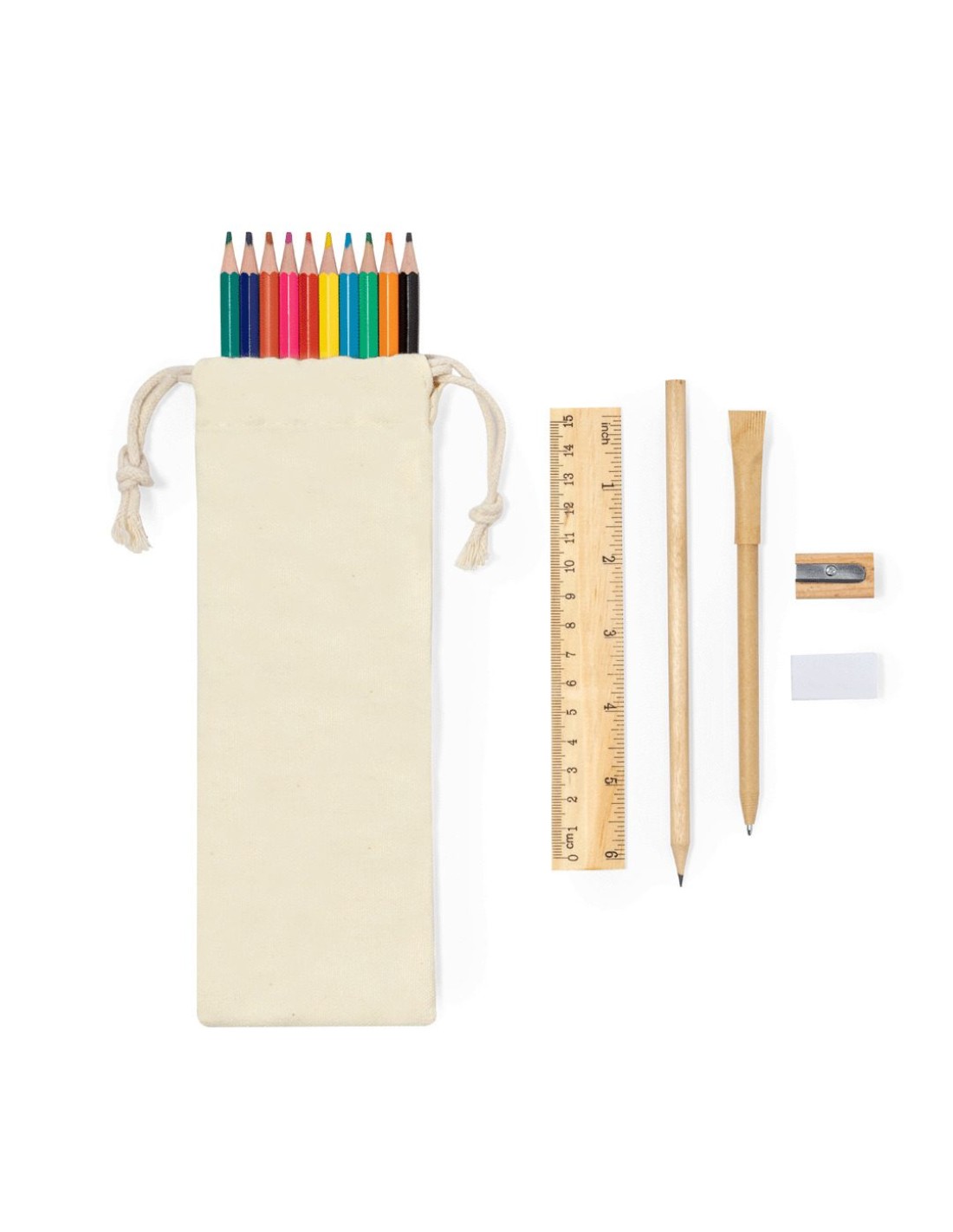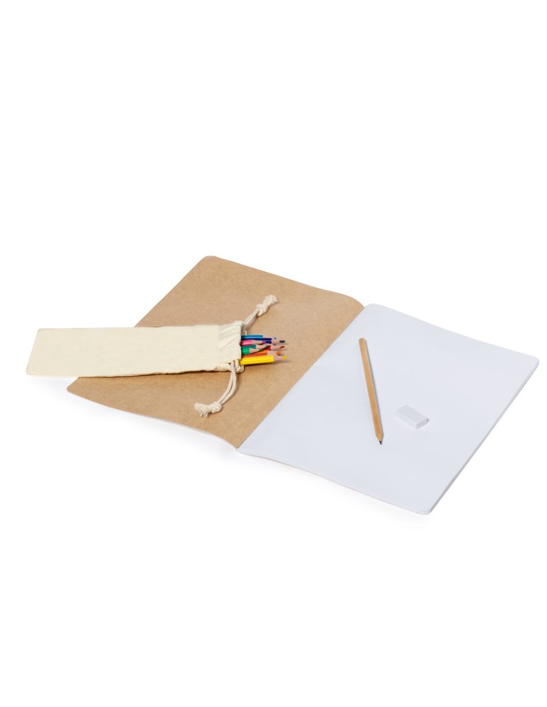 Set de escritura y colores con cuaderno. Divertido conjunto de artículos fabricados en madera compuesto por lápices con minas en varios colores, sacapuntas, bolígrafo fabricado en cartón reciclado y goma. Presentado en una práctica bolsa de algodón 100%.