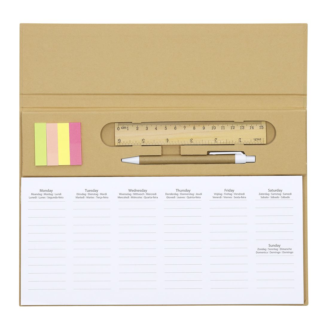 Planificador semanal de mesa. Disponible en 7 idiomas (español, inglés, francés, portugués, alemán, neerlandés, italiano). Incluye: - 125 hojas para planificación semanal - 25 notas adhesivas medianas y 100 mini-notas adhesivas en diferentes colores - Bolígrafo de de mecanismo pulsador, cuerpo en cartón reciclado y tinta azul - Regla de madera - Tapa rígida en cartón reciclado - Lámina protectora de plástico El cartón reciclado proviene del reaprovechamiento de excedente de fabricaciones y reciclaje de papel en el final de su vida útil, convirtiéndose en un lienzo ecológico y sostenible.