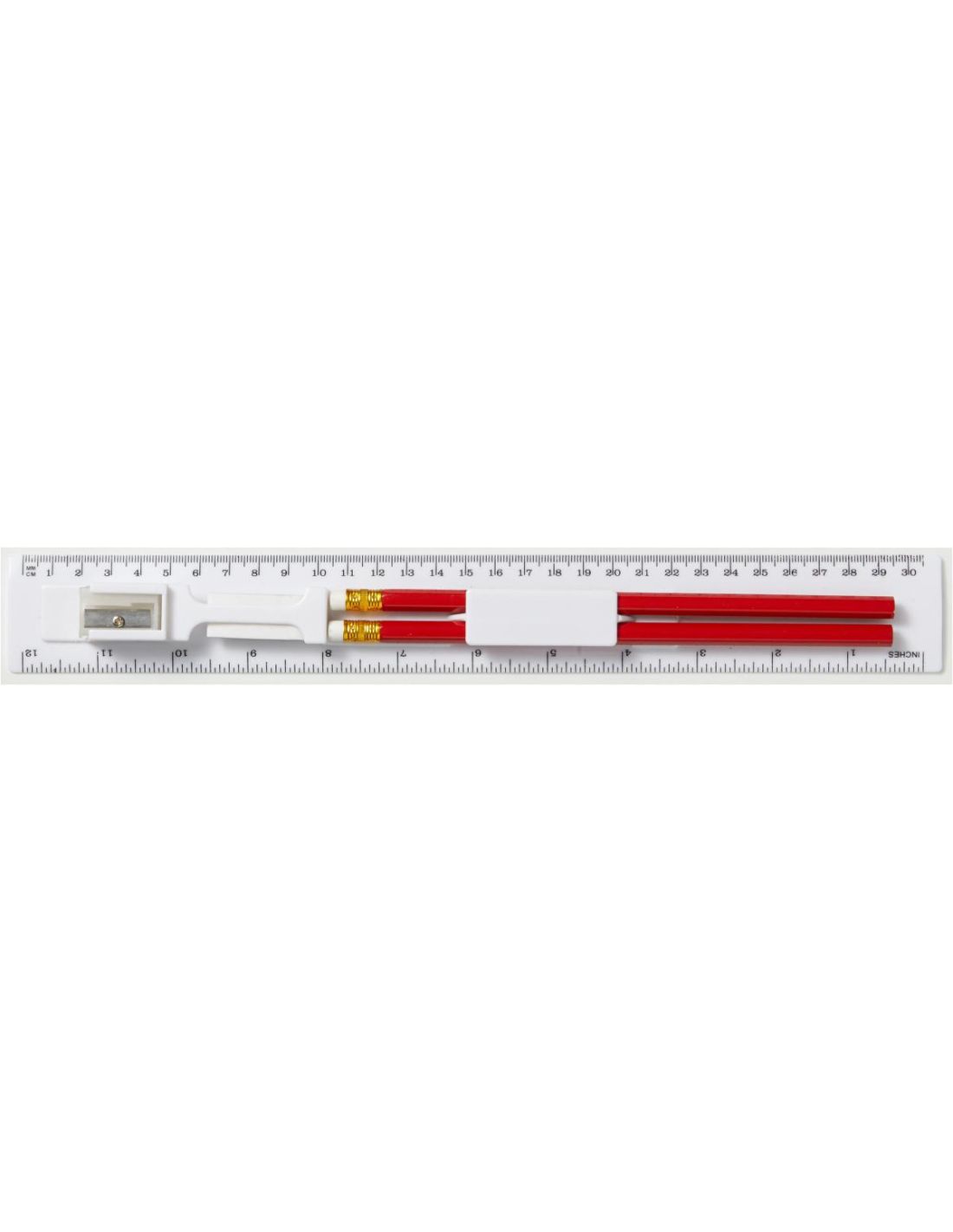 Regla de 30 cm con 2 lápices, sacapuntas y goma de borrar.