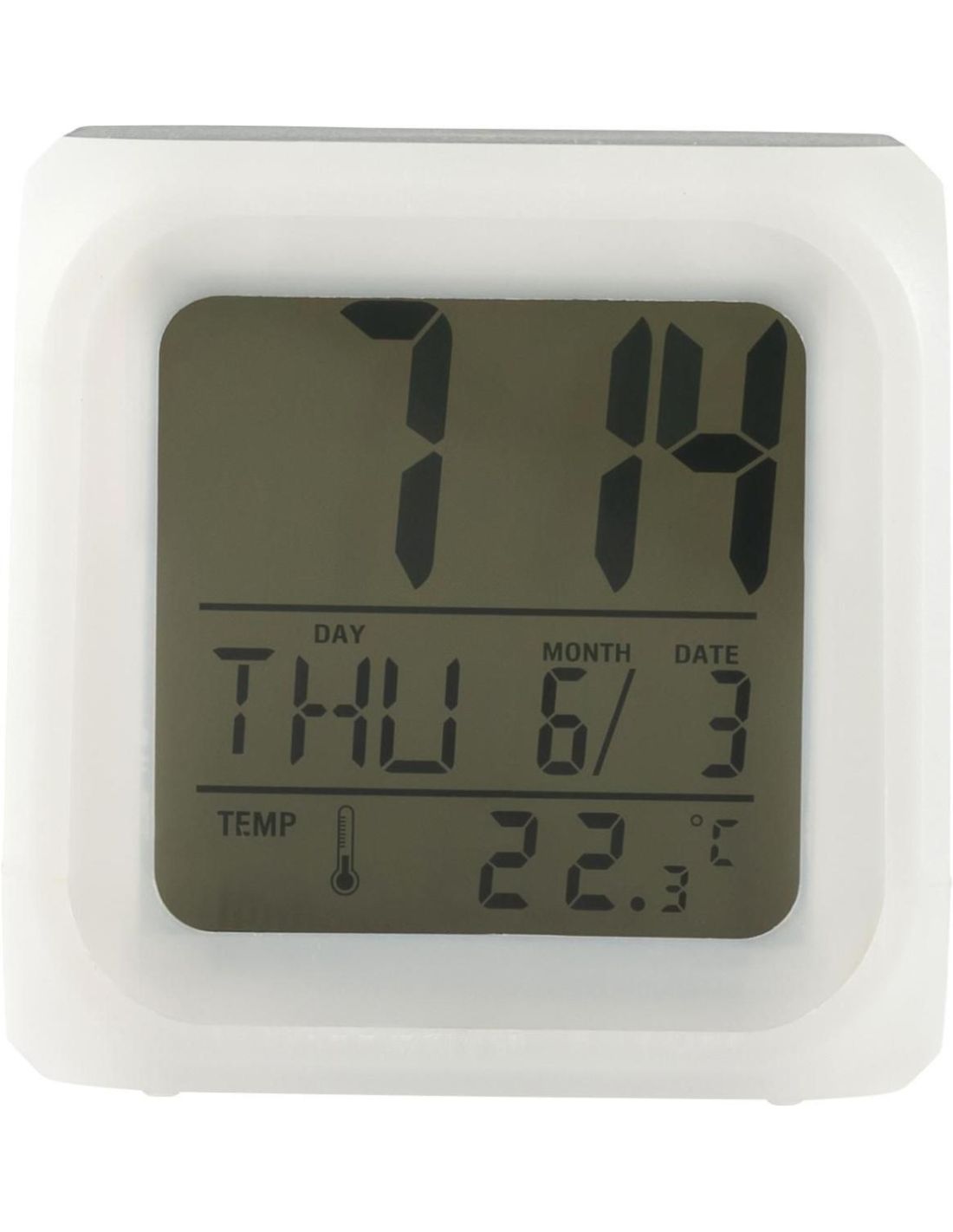 Reloj despertador con forma de dado, de HIPS que cambia de color. Muestra la hora, el día de la semana, la fecha y la temperatura. Pilas incluidas.