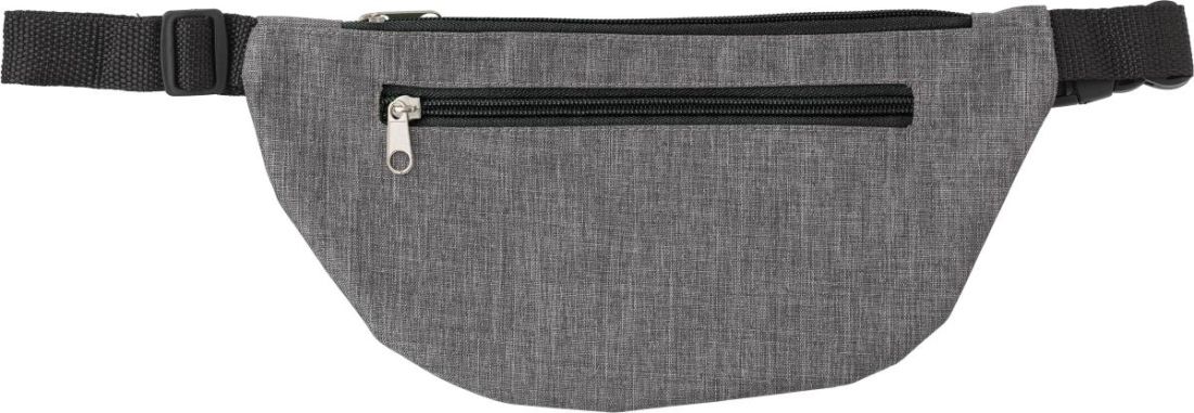 Riñonera de poliéster (300 D) con correa ajustable. Tiene un compartimento principal y un bolsillo frontal, ambos con cremallera.