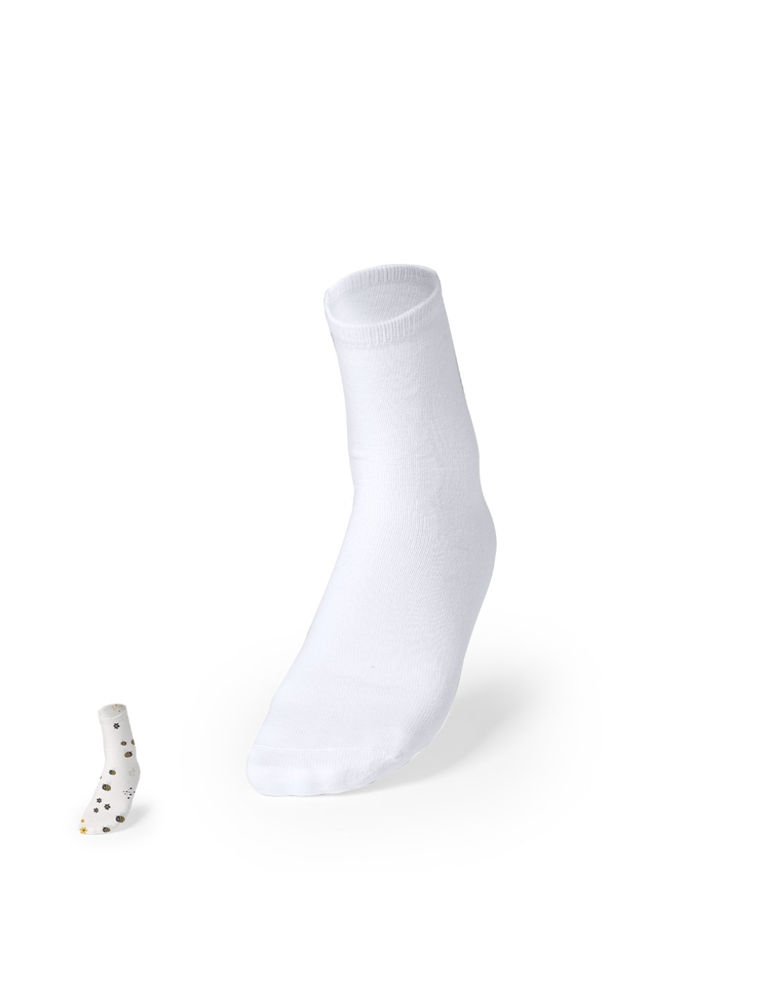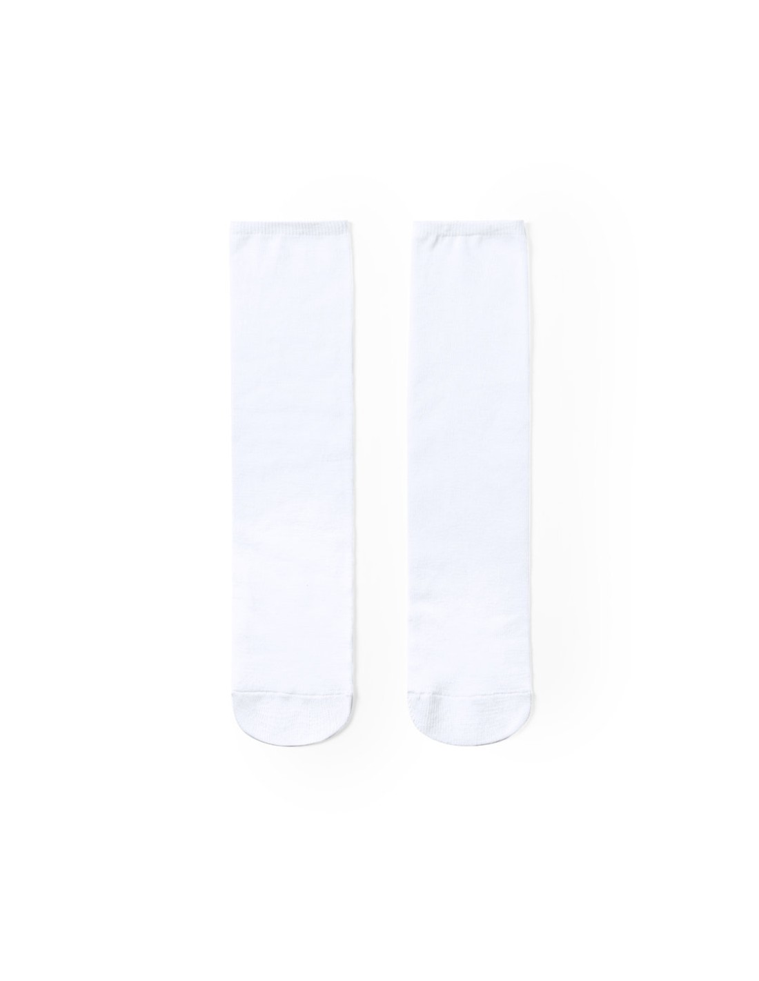 Par de calcetines fabricados en poliéster blanco y especialmente diseñados para marcaje en sublimación. En talla L-XL.