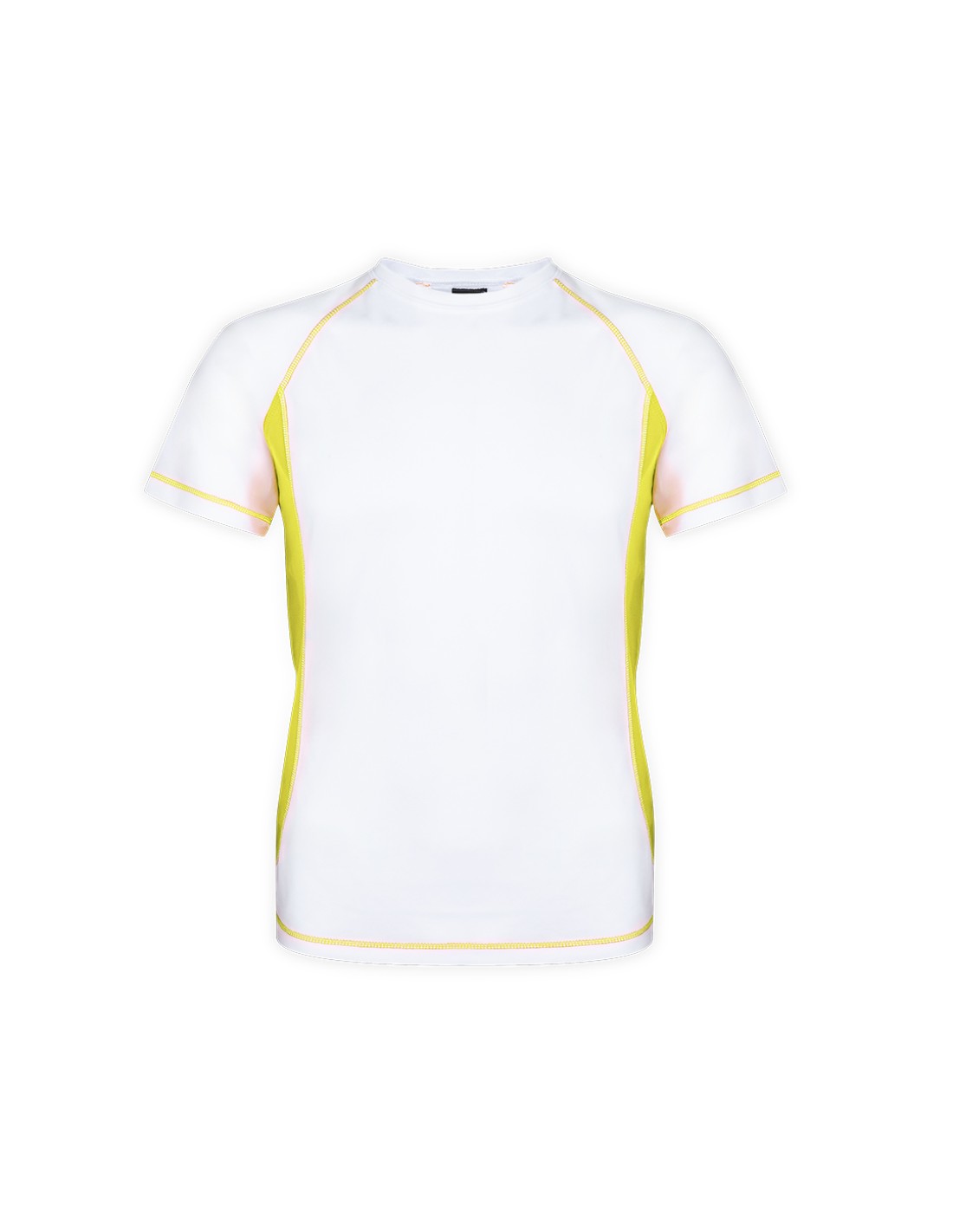Camiseta técnica para adulto en material 100% poliéster transpirable de 135g/m2. Diseño en color blanco con costuras de refuerzo y laterales en vivos colores. Disponible en tallas S, M, L, XL, XXL.