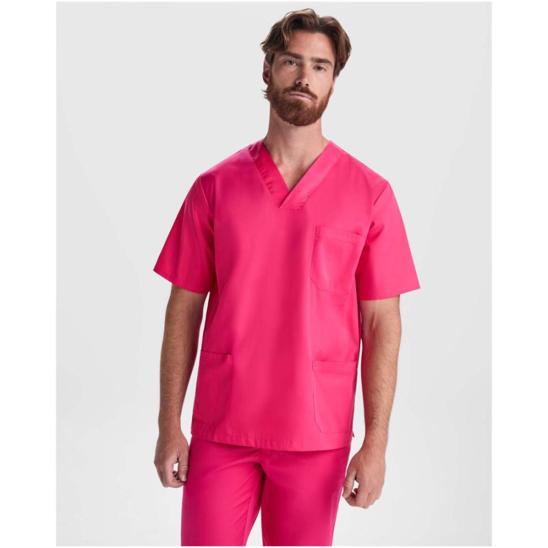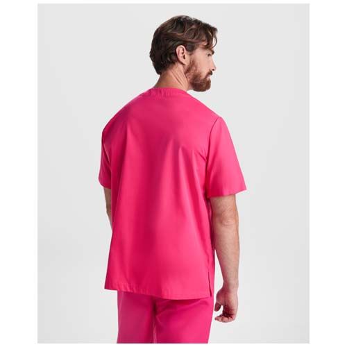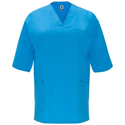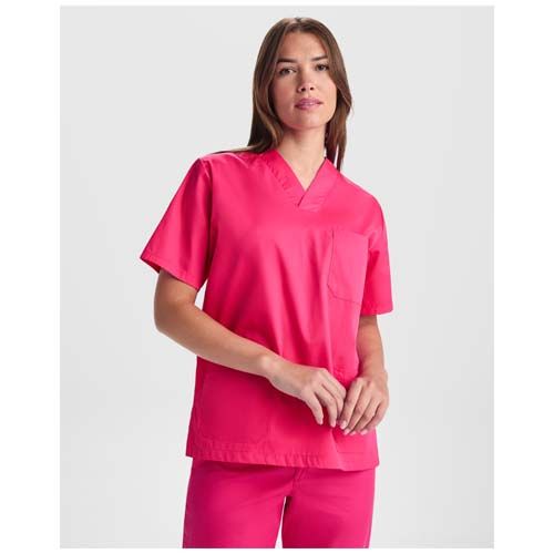 Top de servicio unisex de manga corta. Cuello cruzado de pico. Bolsillo en el pecho y dos bolsillos laterales. Aberturas laterales en el dobladillo.