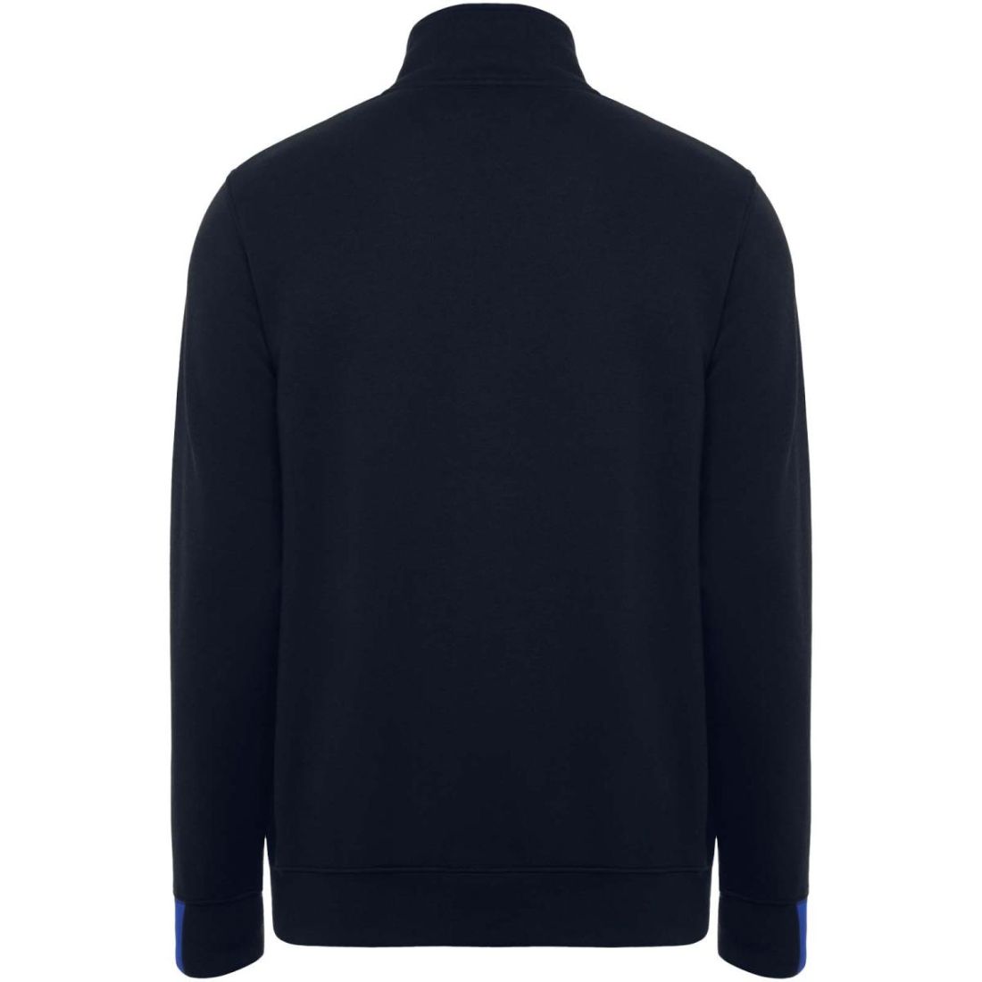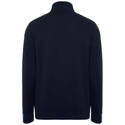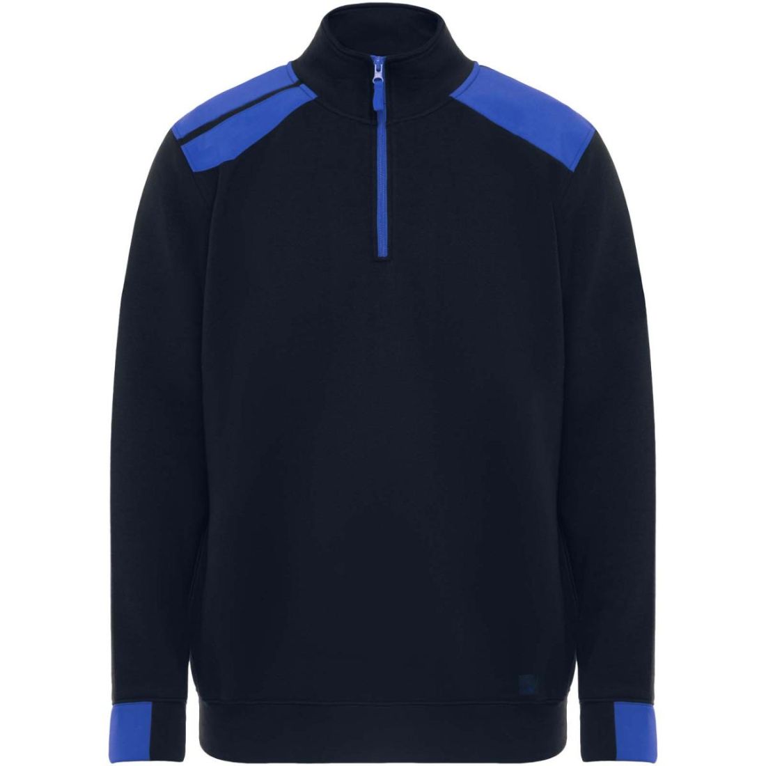 Jersey con media cremallera, un diseño que combina colores y cuello alto. Costuras cubiertas reforzadas en el interior del cuello. Hombros y detalles a contraste. Medio puño y dobladillo en tejido acanalado 1x1.