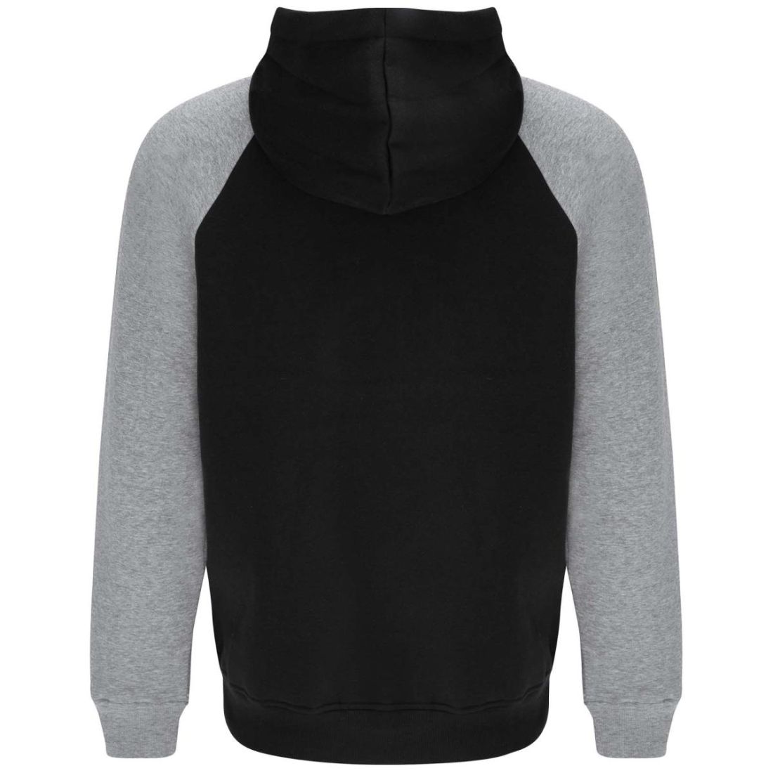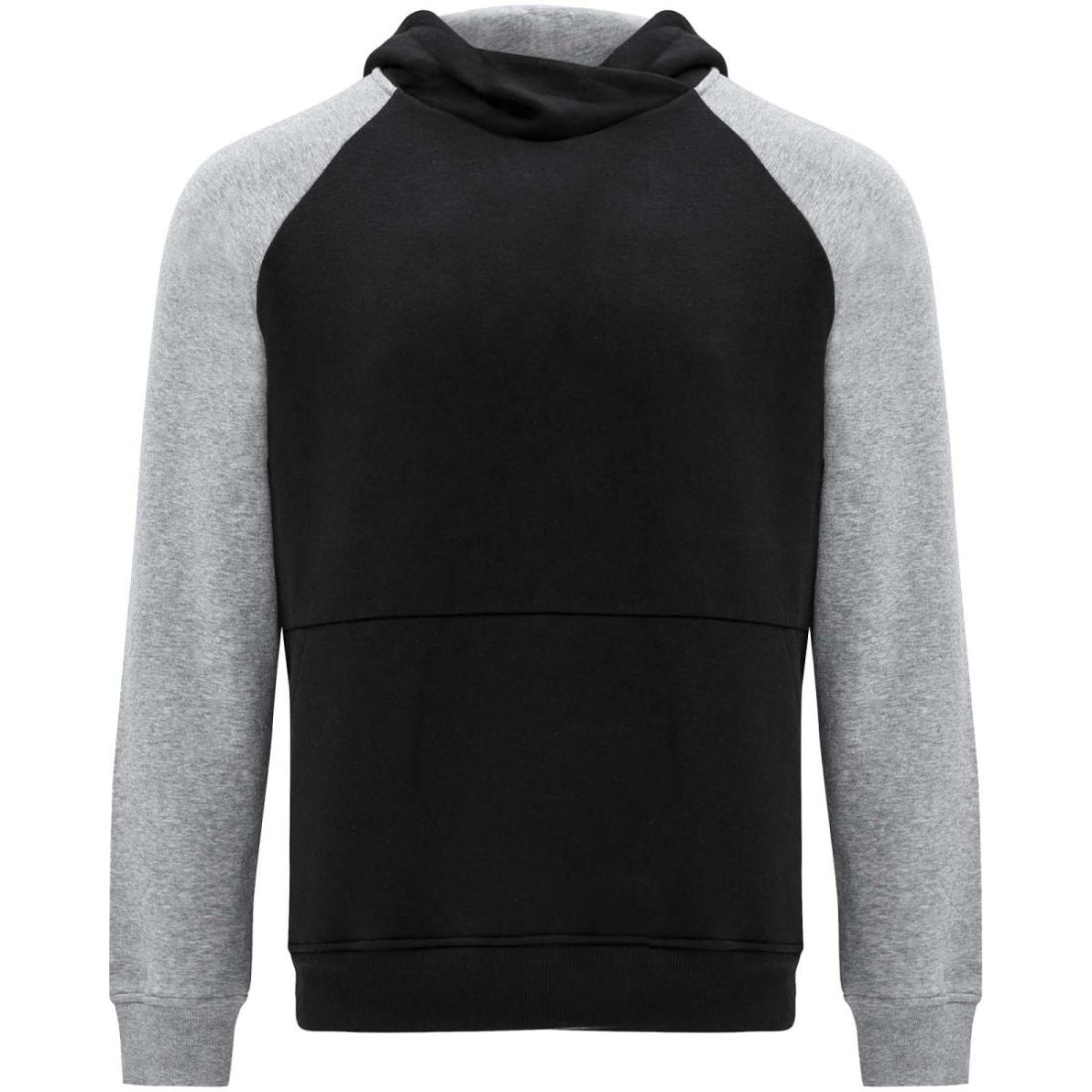 Sudadera con capucha bicolor unisex. Capucha con cuello cruzado y ojales metálicos. Interior de la capucha, cordón de ajuste y mangas raglán en contraste. Bolsillo tipo canguro. Puños y dobladillo de punto de elastano 1× 1. Etiqueta extraíble.