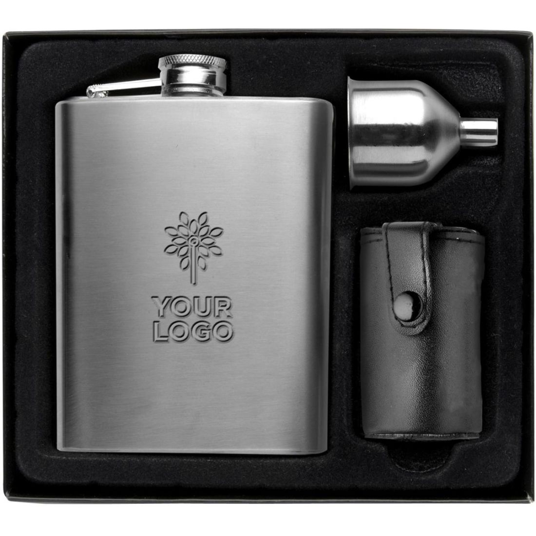Petaca (220 ml) con 4 vasitos (30 ml) y embudo de acero inoxidable 304. Presentado en una caja de regalo.