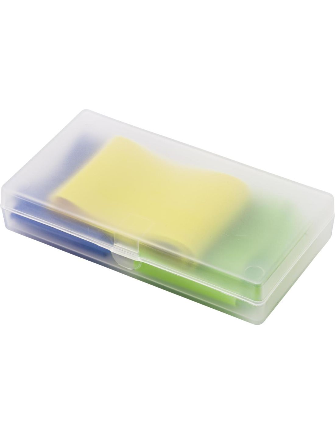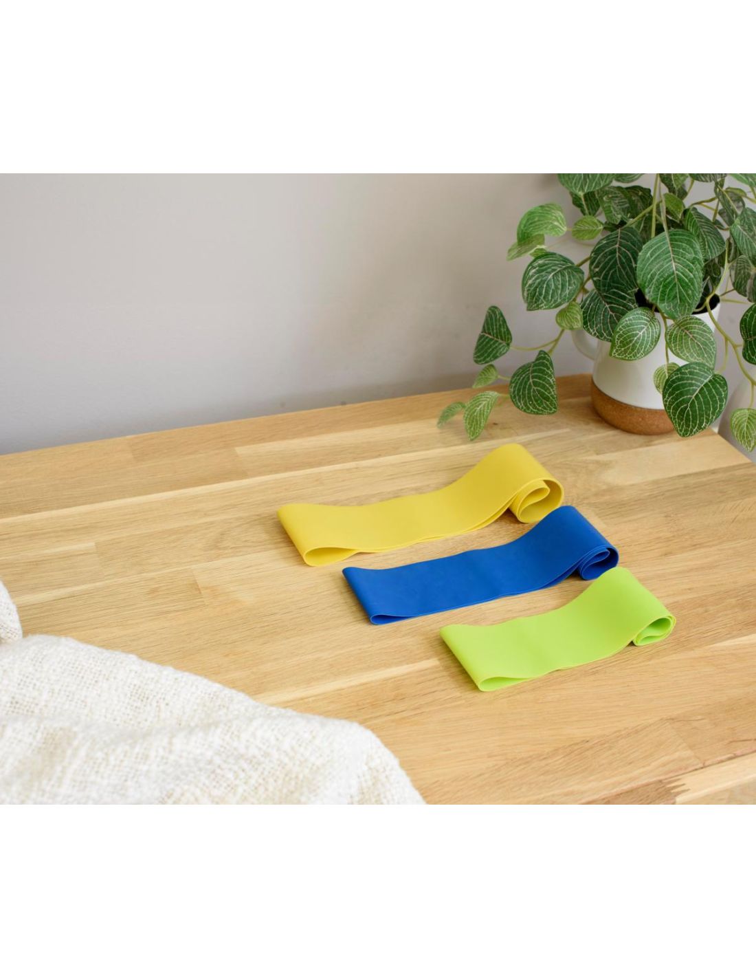 Set de 3 bandas elásticas para hacer deporte, con diferentes resistencias. Presentadas en una caja de plástico.