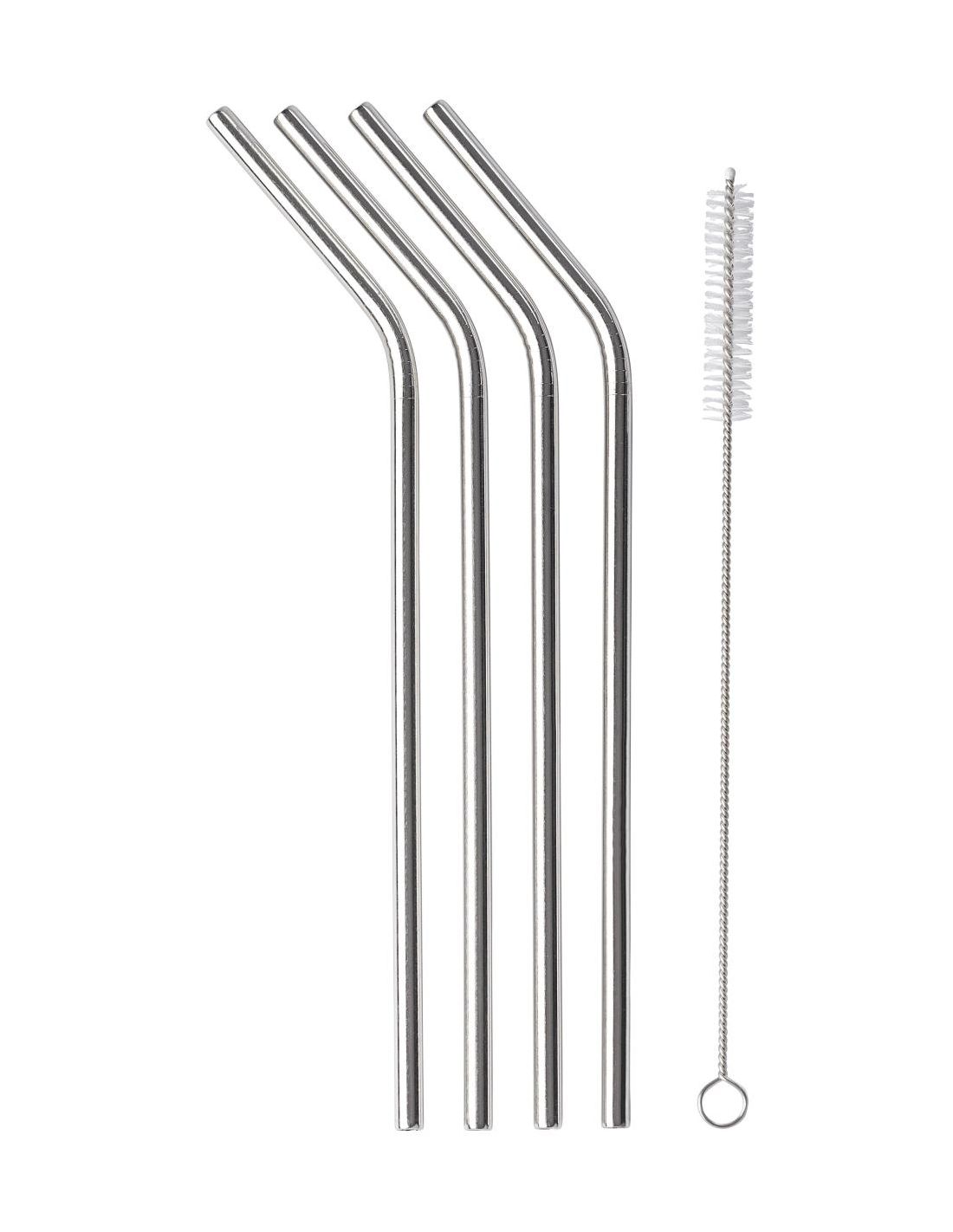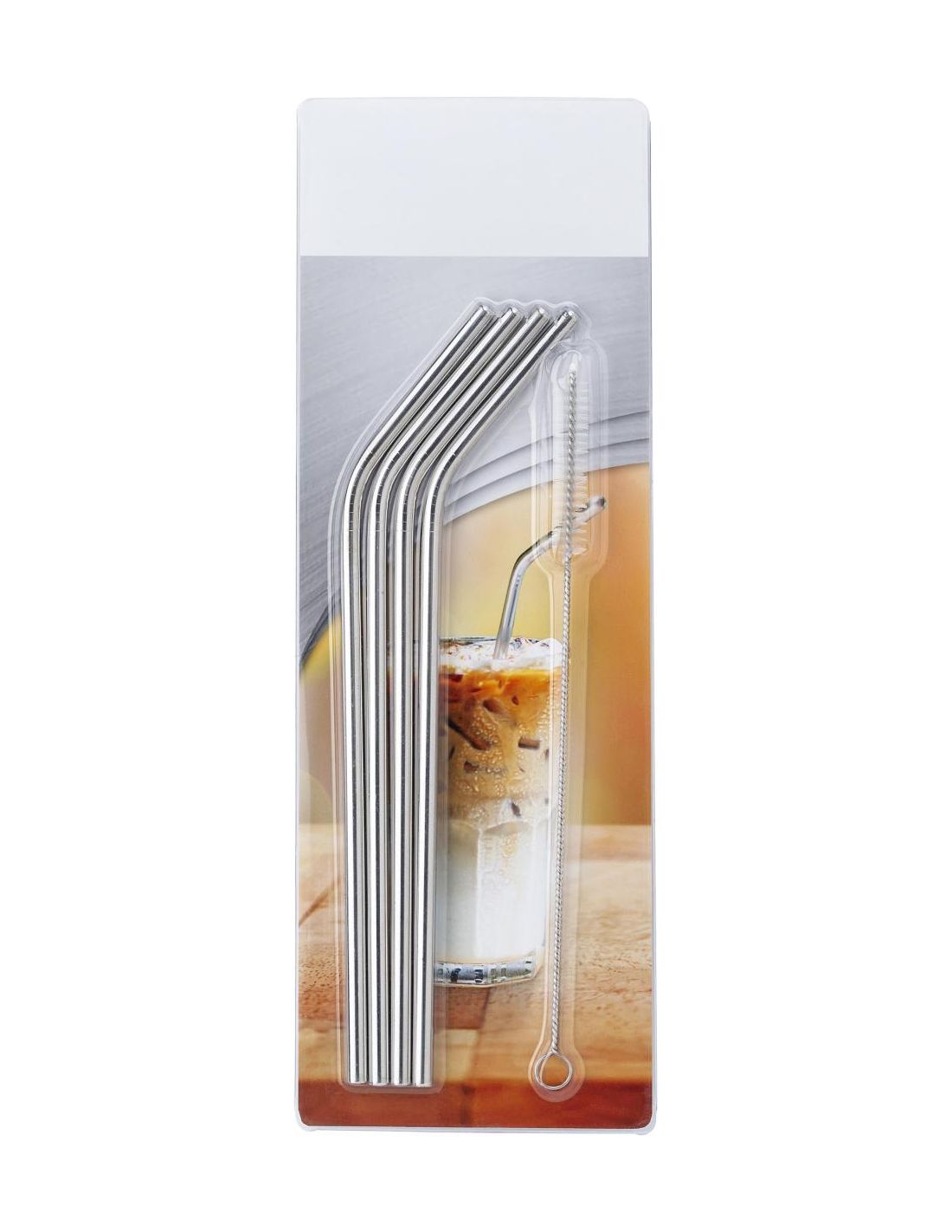 Blister con 4 pajitas reutilizables de acero inoxidable de 23 cm de longitud. El set incluye un cepillo de limpieza.