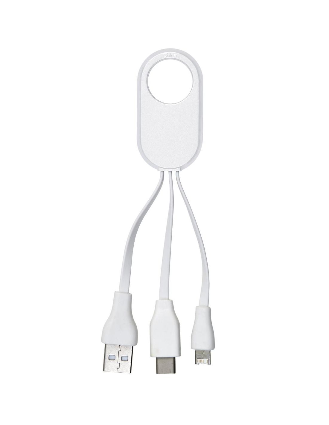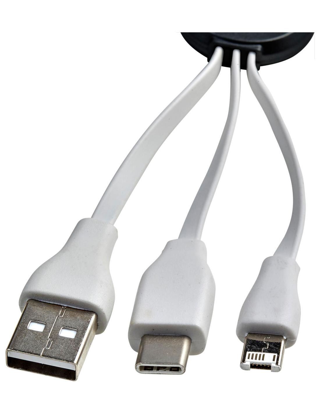 Set de cables de carga de ABS con conectores USB-C, lightning y USB estándar . Cada cable tiene 5,5 cm aprox. de largo.