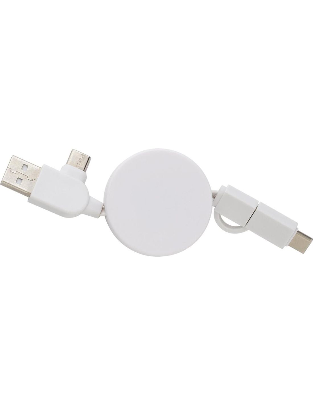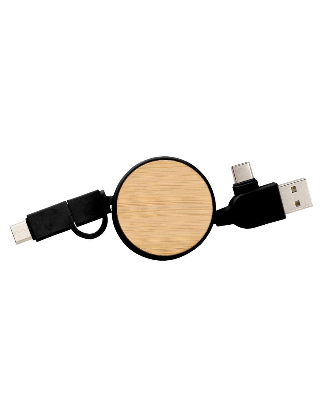 Set de cables extensible (aprox. 35 cms. por cada lado) de bambú y ABS Con USB-C, lightning y USB-A. Presentado en una bolsa de papel marrón.