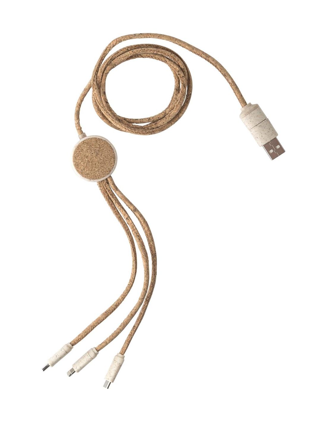 Cables de carga de corcho. Cable de corcho (120 cm) y terminales con USB-A/USB-C, lightning y micro-USB, todos de paja de trigo. Presentado en una caja de papel kraft.