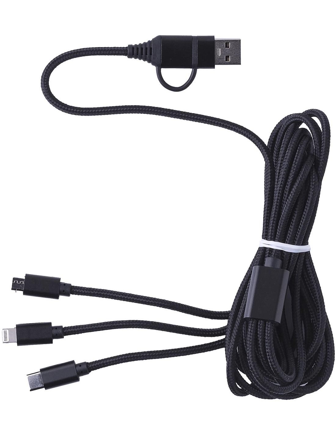 Cable de carga de nailon de 290 cm. Velocidad de 1,5 A. Conexión A+C, micro, tipo-c y lightning. Los hilos del cable son 100% de cobre.