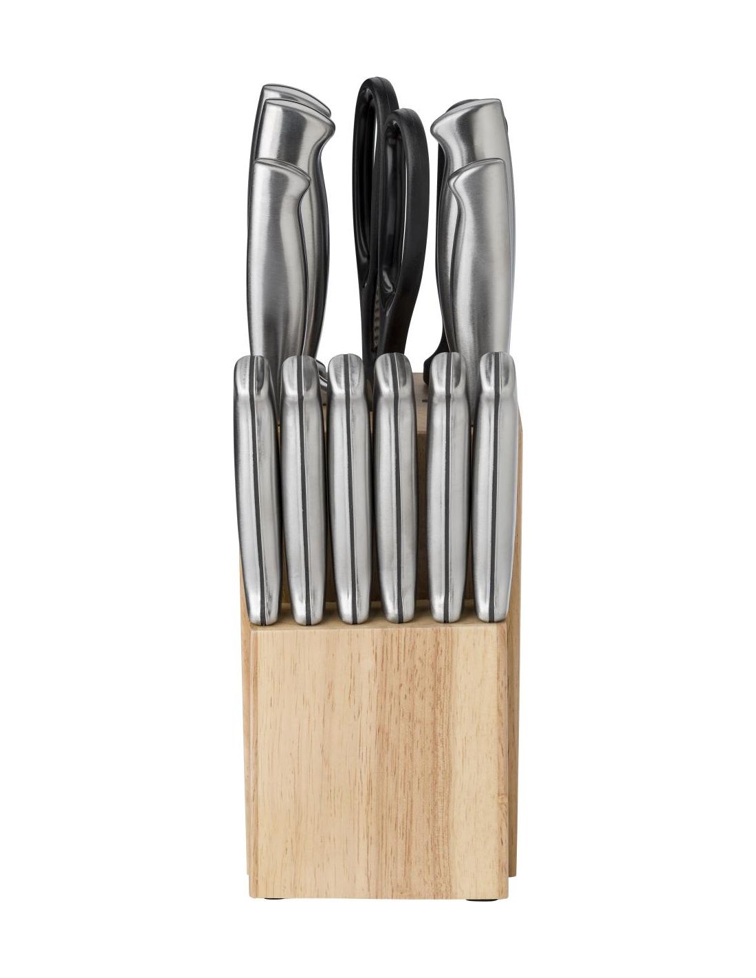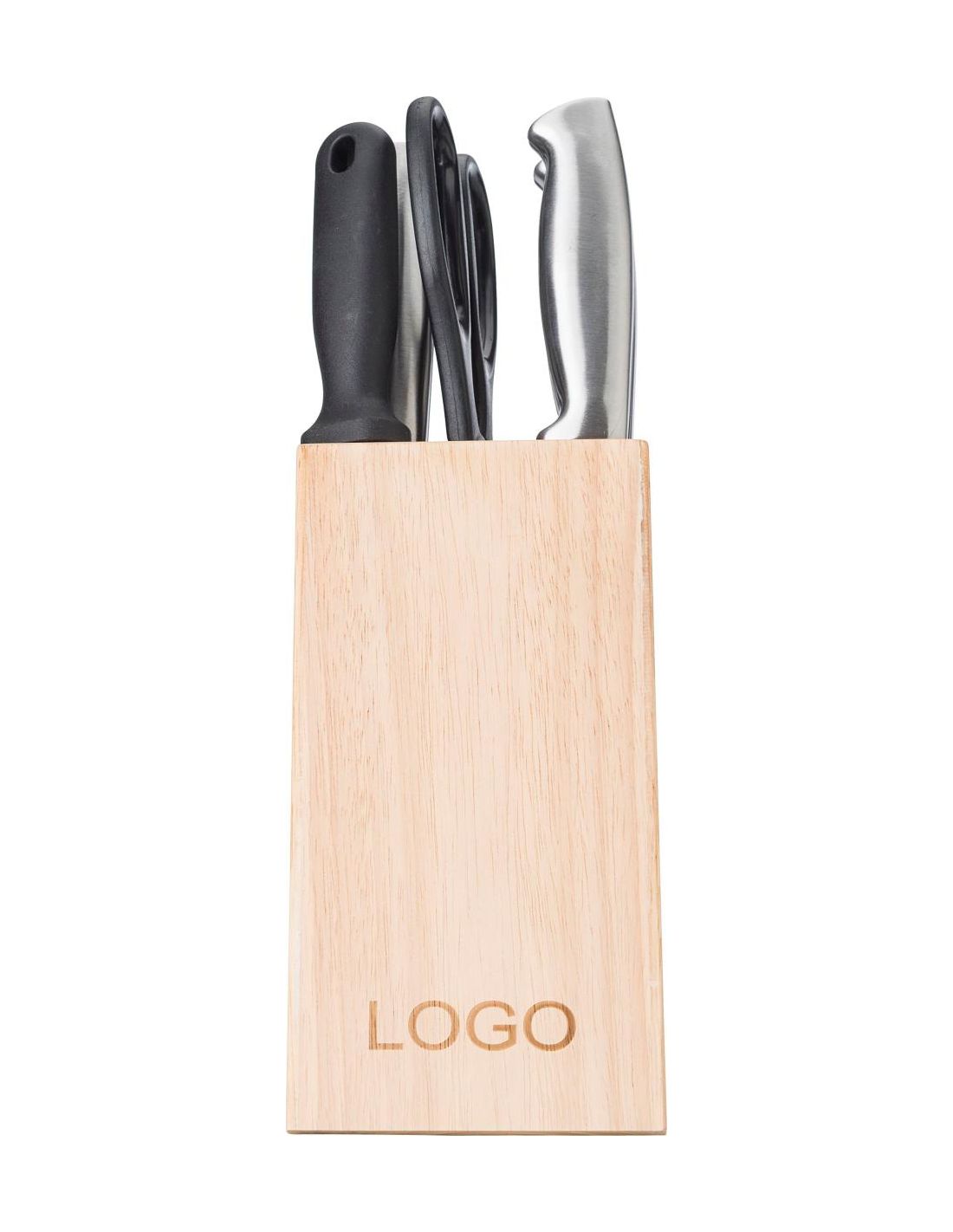 Tacoma de madera con 14 piezas de acero inoxidable y PP: Tijeras, afilador y once cuchillos diferentes.