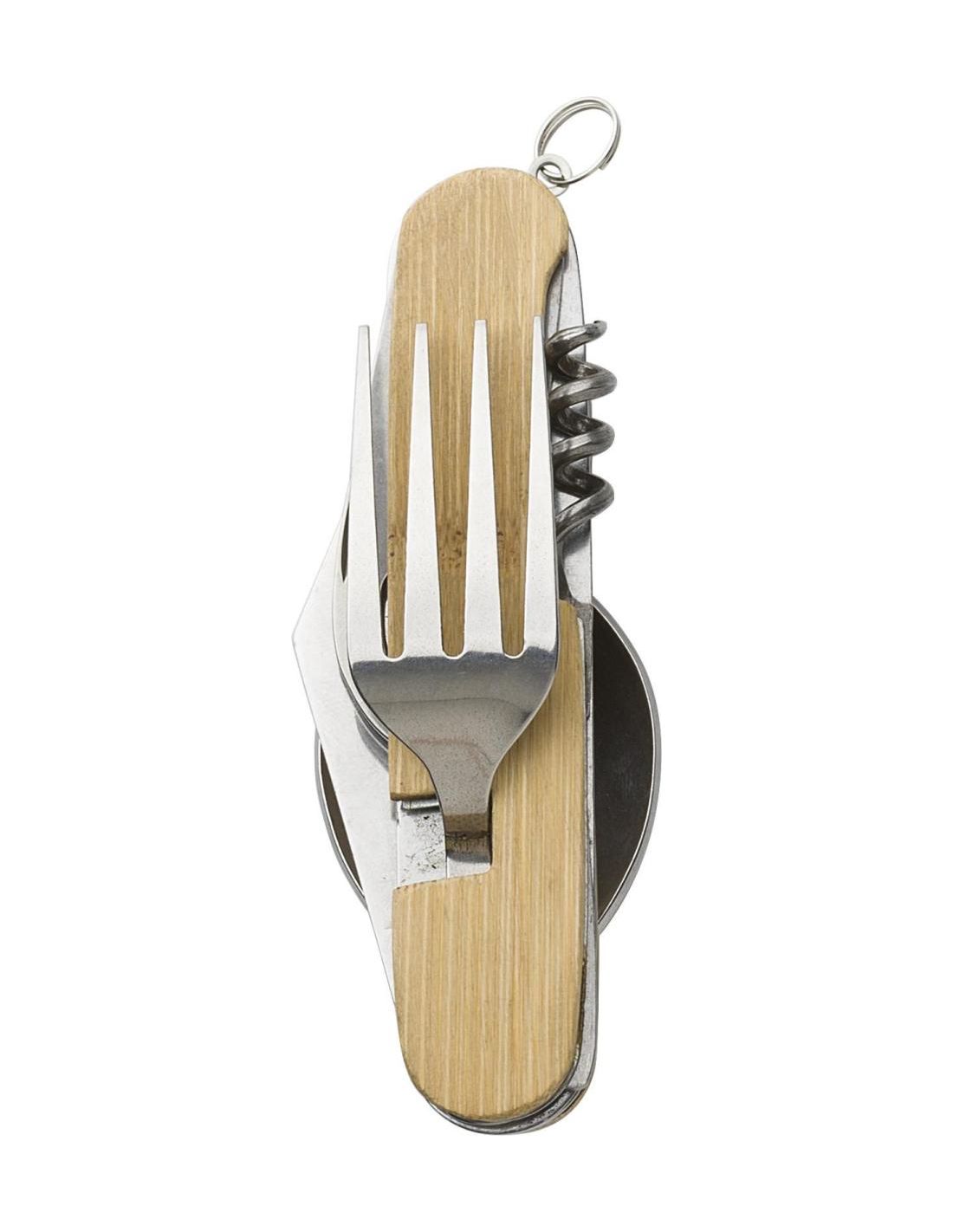 Set de cubiertos multifuncionales de bambú y acero inoxidable (cuchara, tenedor, cuchillo, abrebotellas, cuchillo más pequeño). Los cubiertos se pueden separar para poder usar con ambas manos. Presentado en una caja de cartón marrón.