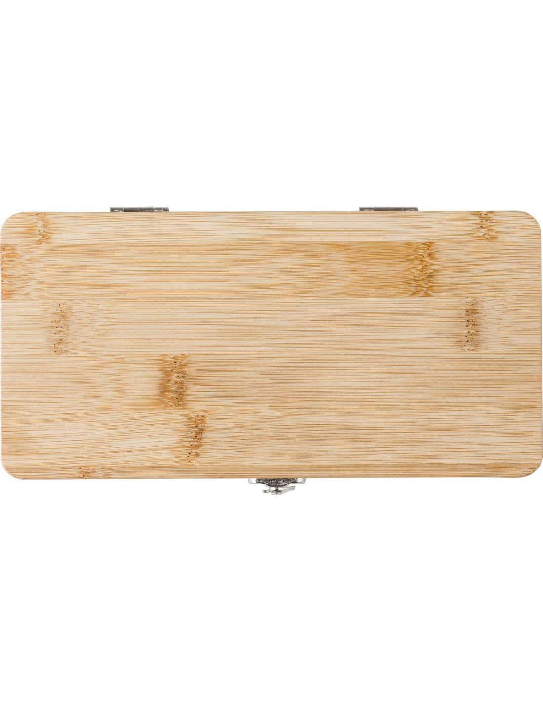Set de herramientas de acero al carbono de 27 piezas. Incluye: tres destornilladores, diez puntas en el soporte, tres tamaños ranurados, tres tamaños Torx, un adaptador, cuatro enchufes, un cortador, un mango y un conector. Presentado en una caja de bambú con clip de hierro.