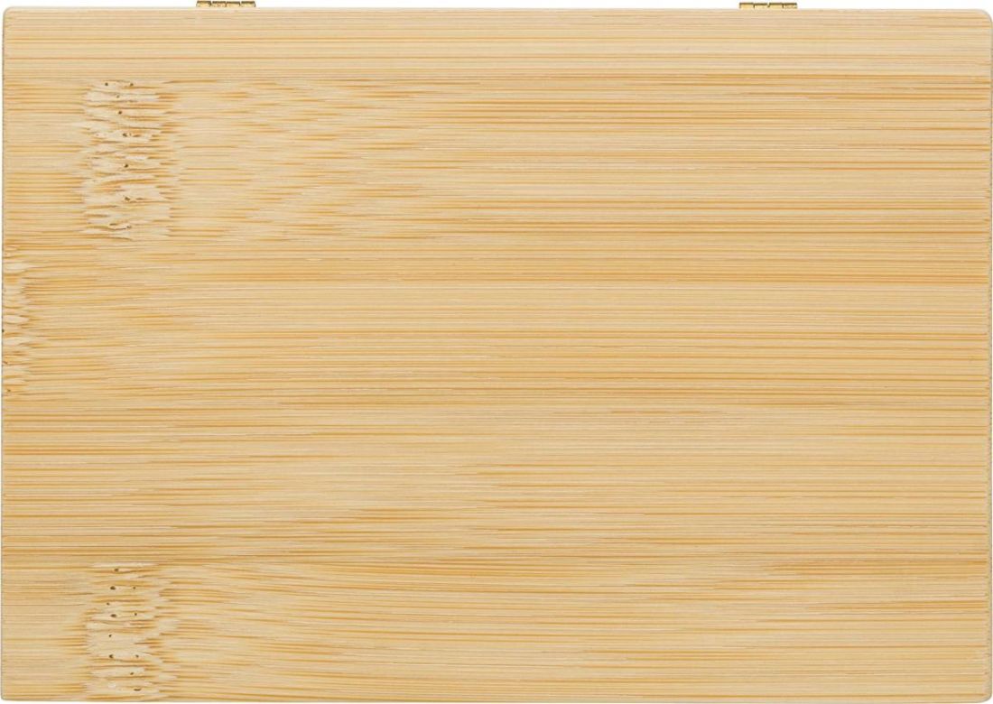 Set de manicura con 4 piezas (cortaúñas, tijeras, pinzas y lima) en una caja de bambú imantada. Presentado en una caja de cartón marrón.