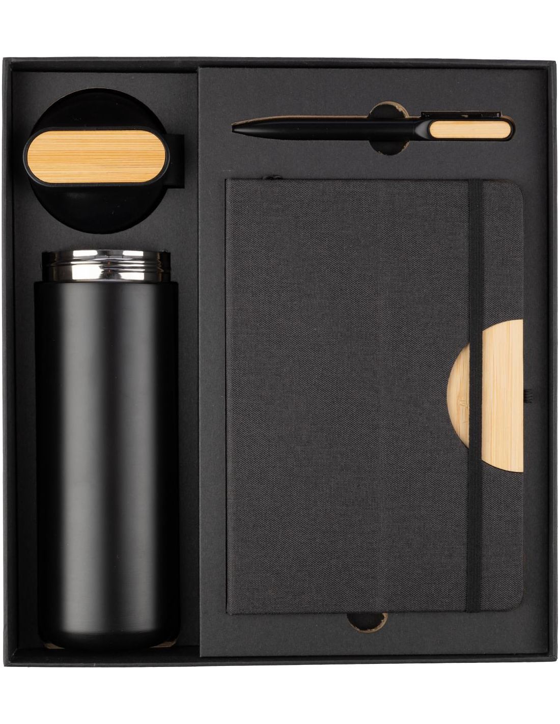 Caja de regalo de cartón negro con 3 artículos: Termo de doble pared de acero inoxidable (640 ml) con tapa de PP y correa de silicona. Interior inox.304, exterior inox. 201; Bolígrafo giratorio de aluminio mate y escritura azul; Cuaderno de rPet (300D) (aprox. A5) con 80 páginas lineadas y cubierta plegable que se convierte en un soporte para teléfono. Todas las piezas con detalles de bambú.