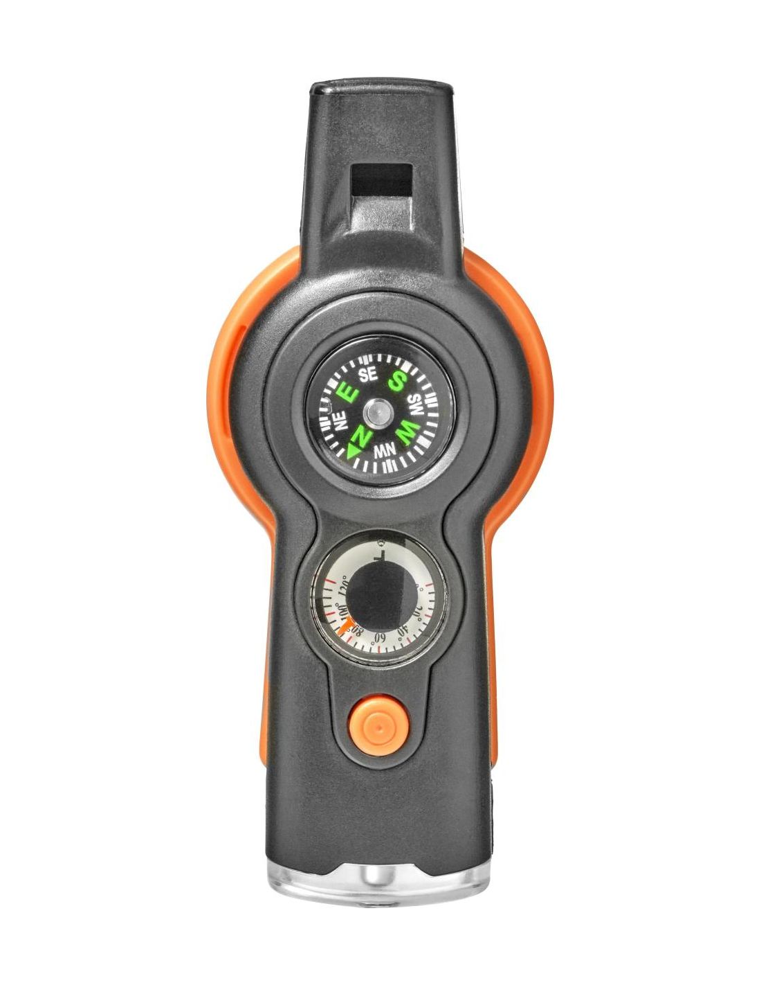 Set de supervicencia 6 en 1, de ABS. Incluye silbato, brújula, termómetro (°F), linterna, espejo, lupa y cordón con cierre de seguridad.