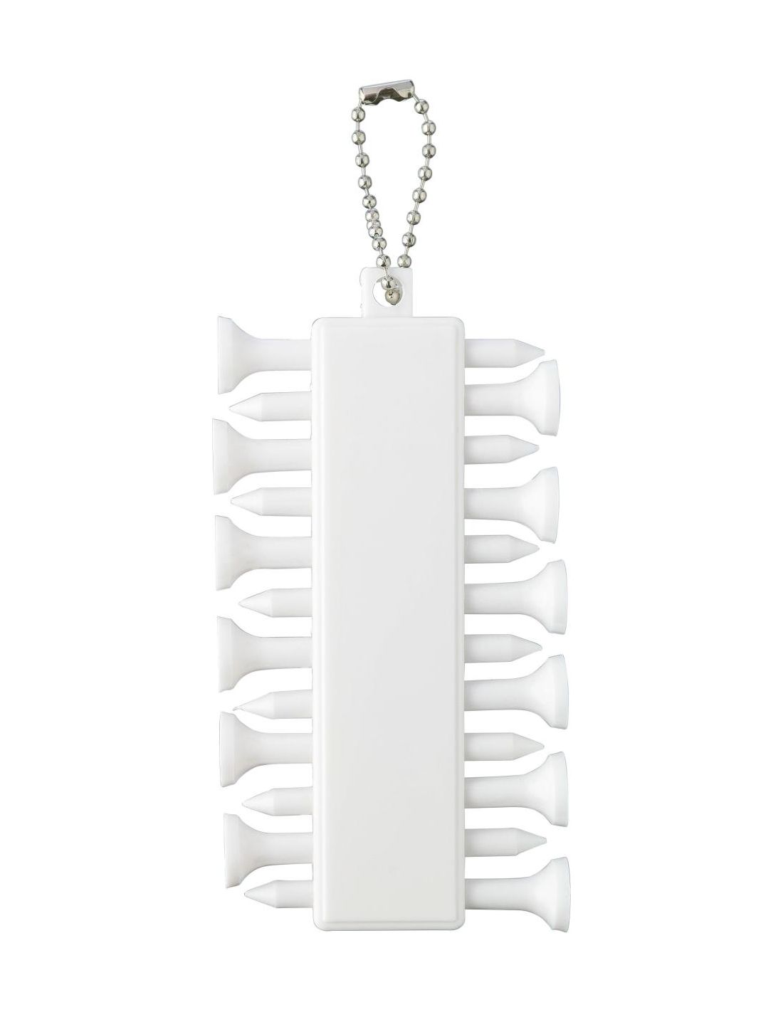Juego de tees de golf de ABS reciclado que consta de 12 tees en un soporte compacto con tres marcadores en la parte trasera. Incluye un cordón metá…