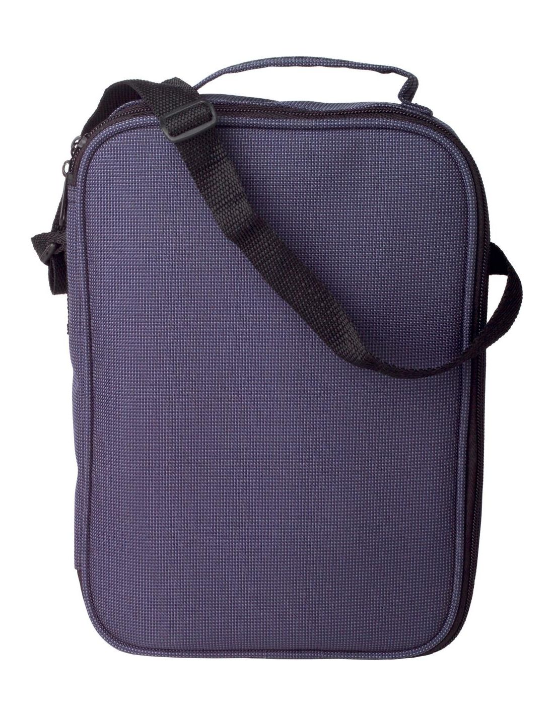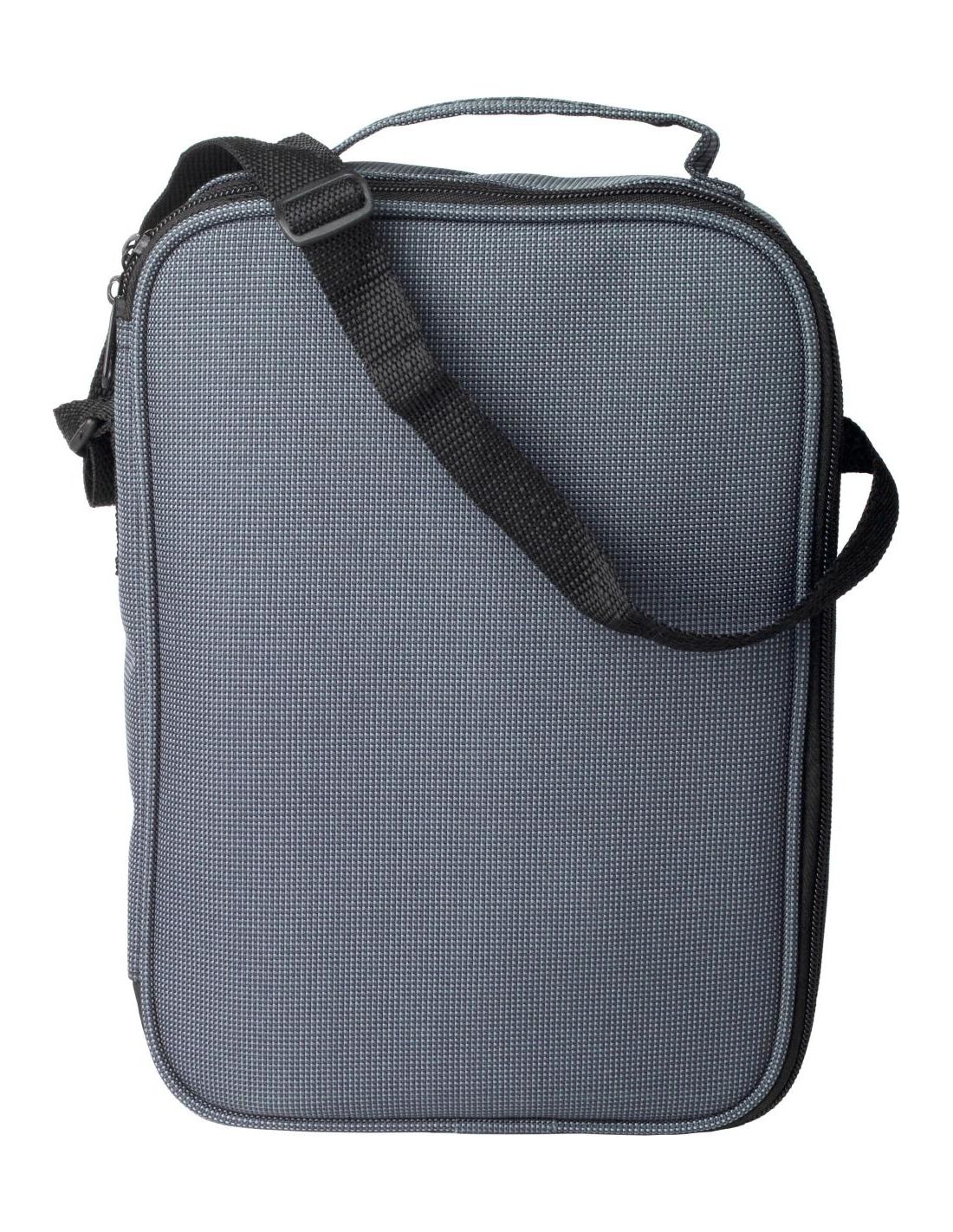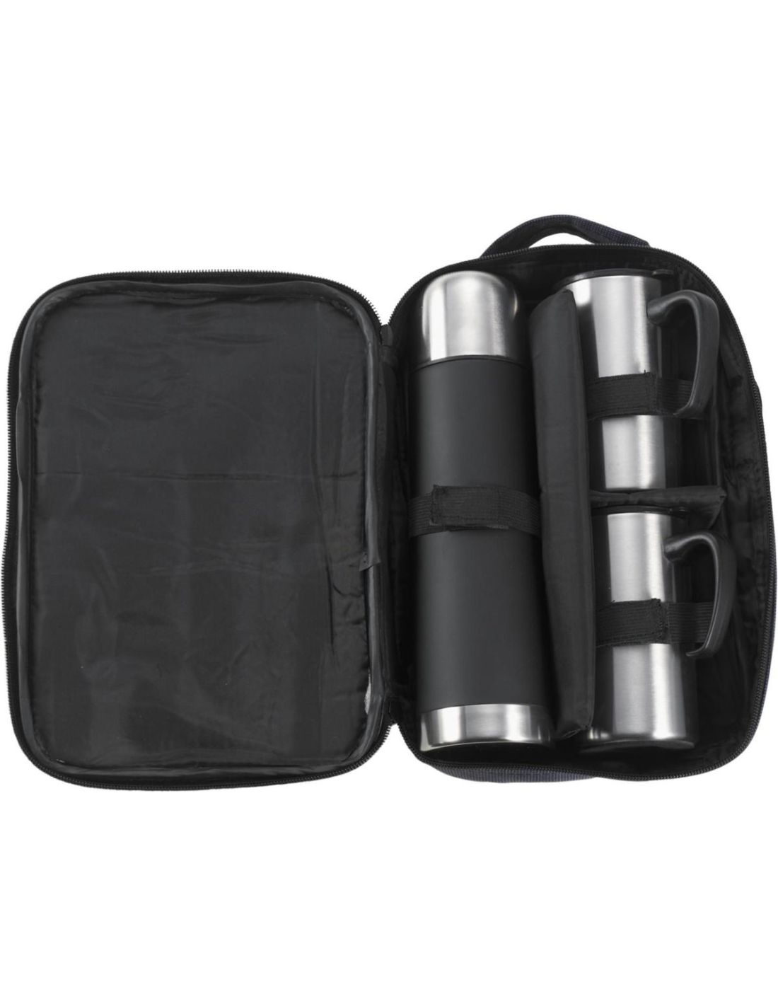 Termo con doble pared (500 ml) y 2 tazas (260 ml), de acero inoxidable. Presentado en un estuche de nailon con cremallera, asa y bandolera.