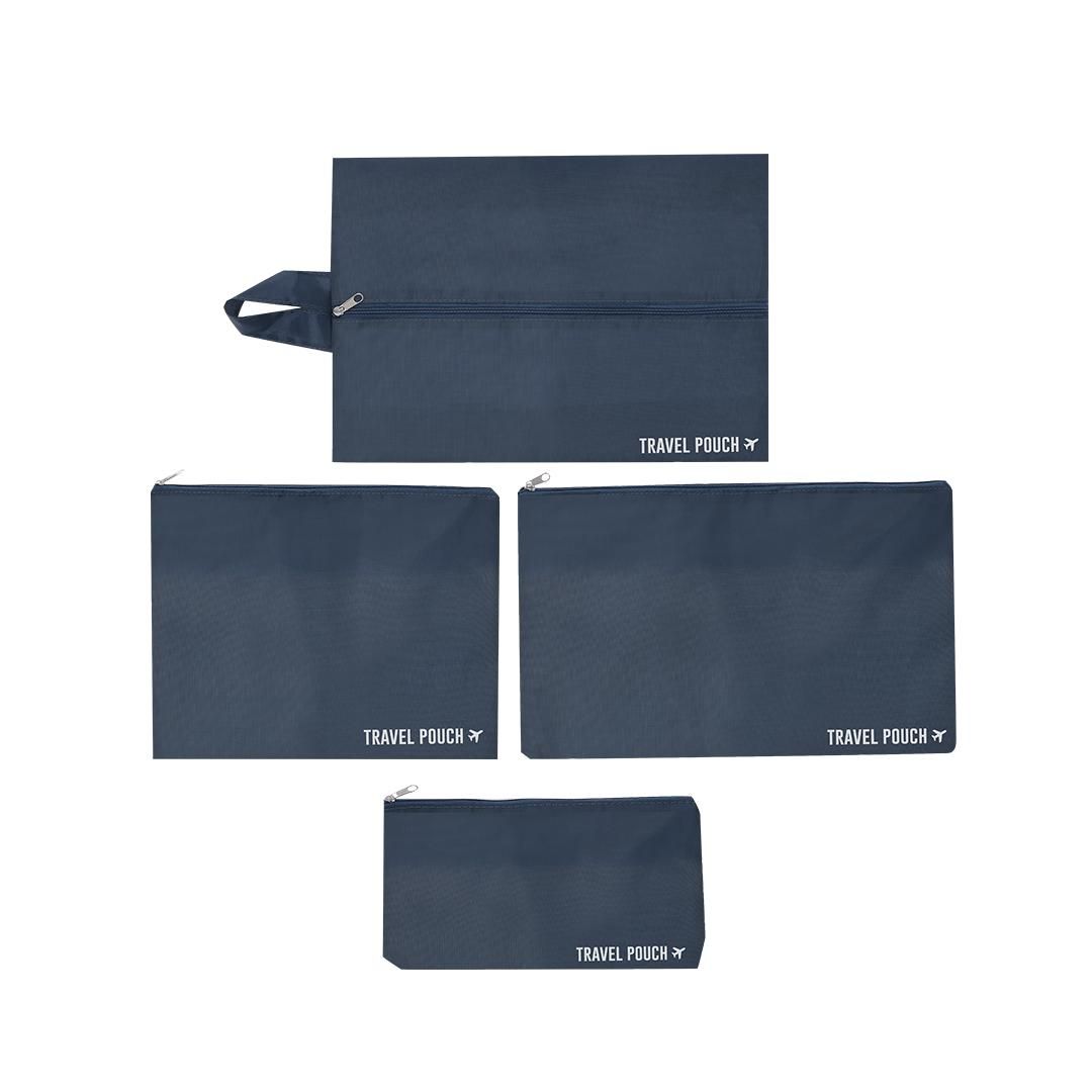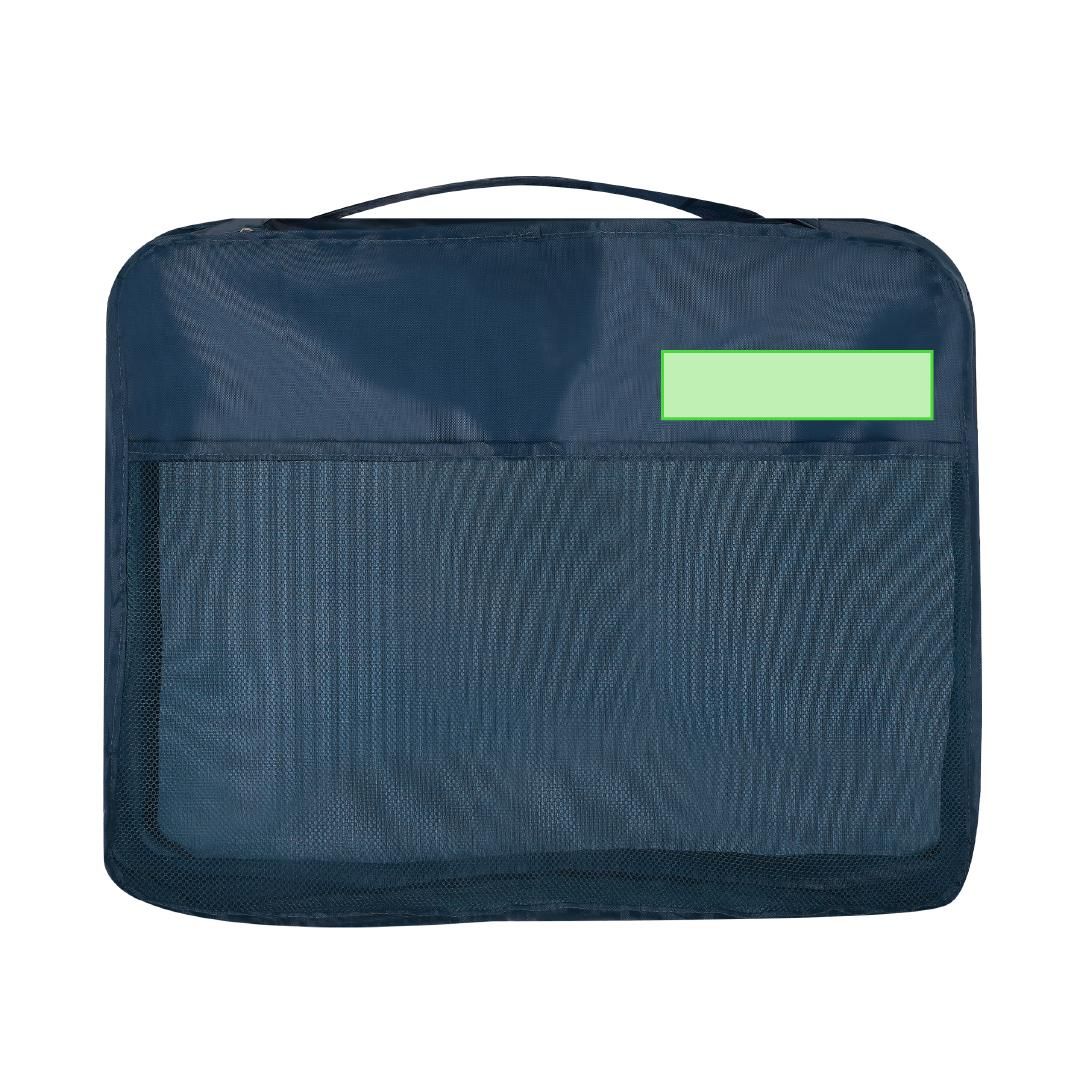 Set organizador de 7 piezas confeccionado en Poliéster 210D. Ideal para optimizar el espacio en tu maleta de viaje. Incluye: - 3 bolsas de ropa en tamaños XL/L/M. con cierre de cremallera y tirador metálico, con parte superior en malla. Incluye asas de transporte. - Bolsa zapatero, extensible, con cierre vertical de cremallera y tirador metálico. Incluye asa de transporte. - 3 bolsas en tamaños XL/L/M. Con diseño de tejido sólido y cierre superior en cremallera con tirador metálico.