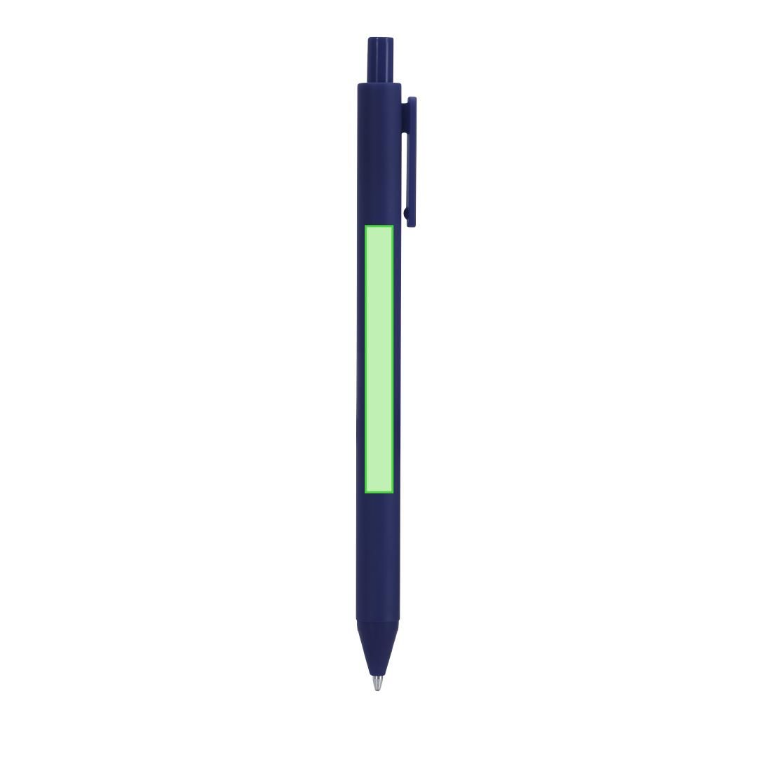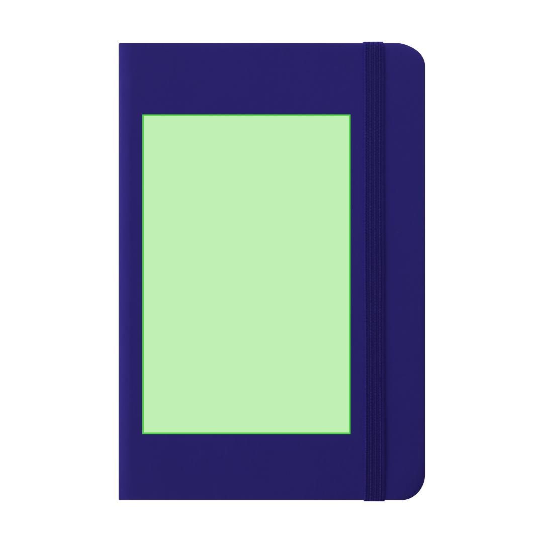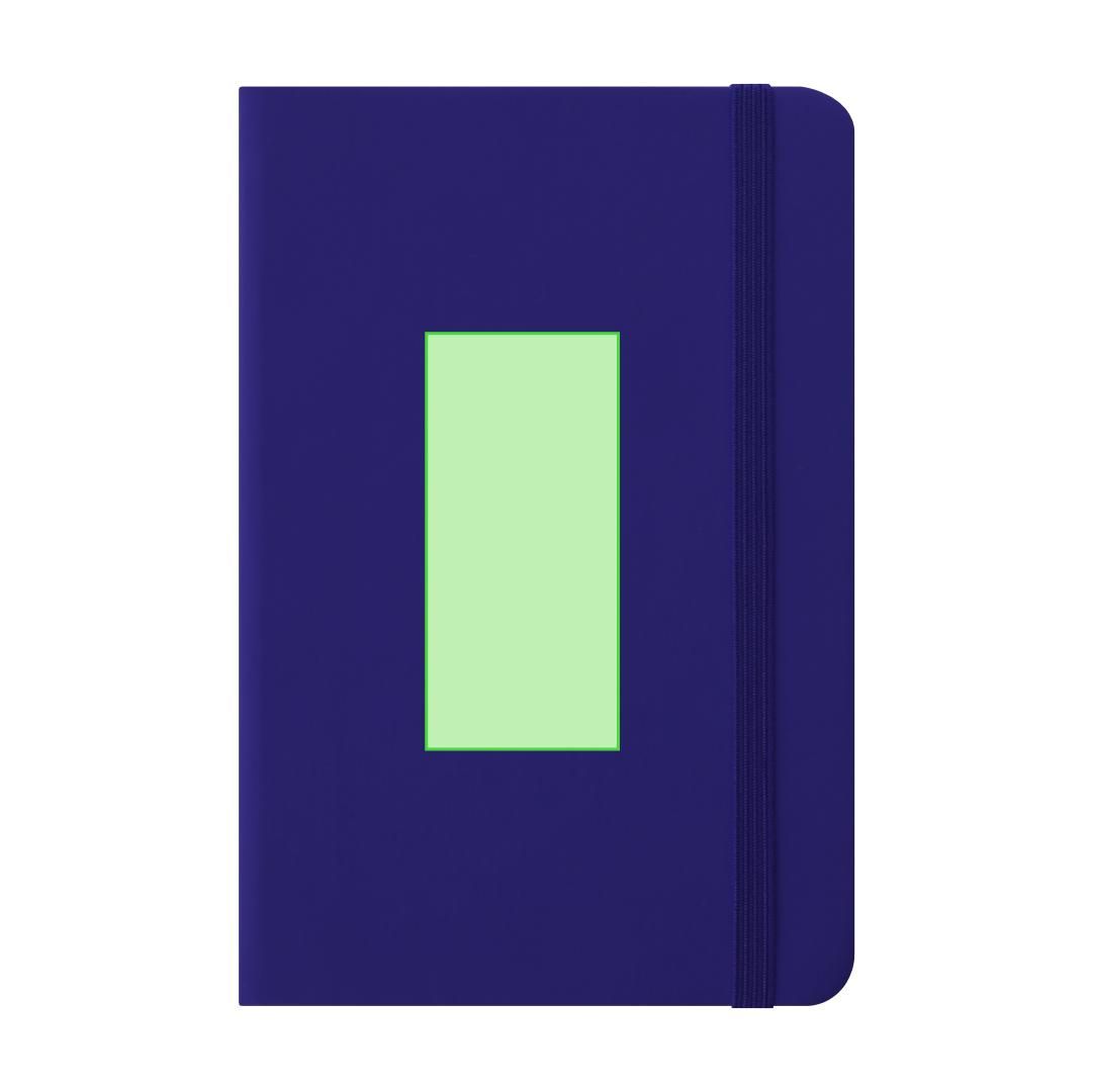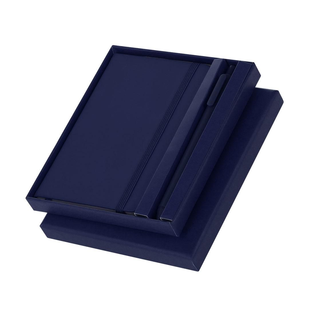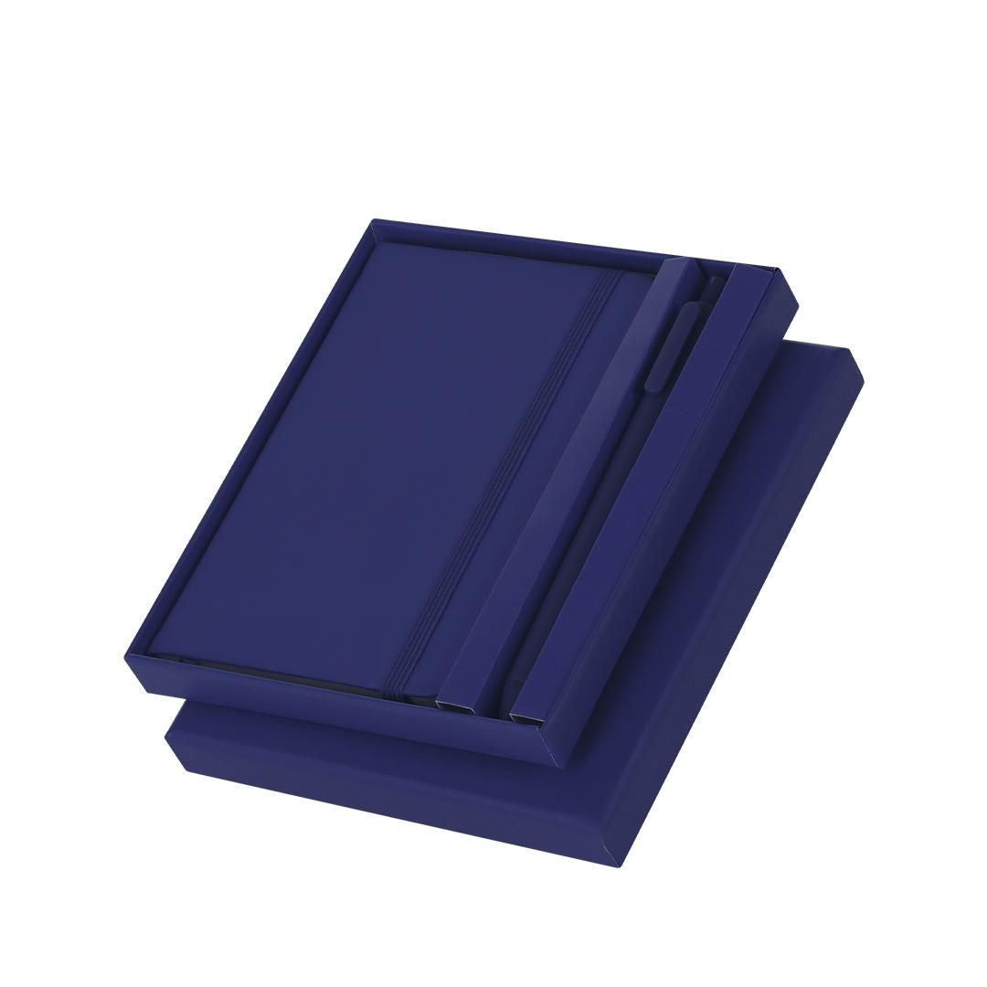 Set de bloc de notas y bolígrafo fabricados en PU. El set incluye: - Bloc de notas fabricado en PU. Incluye 80 páginas de color crema con líneas, marcapáginas y cinta elástica de cierre a juego. - Bolígrafo, con cuerpo en color sólido en acabado caucho. Dispone de clip, mecanismo pulsador y tinta azul.