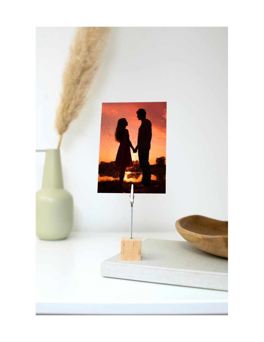 Soporte de madera y acero,con una pinza para fotos o notas.