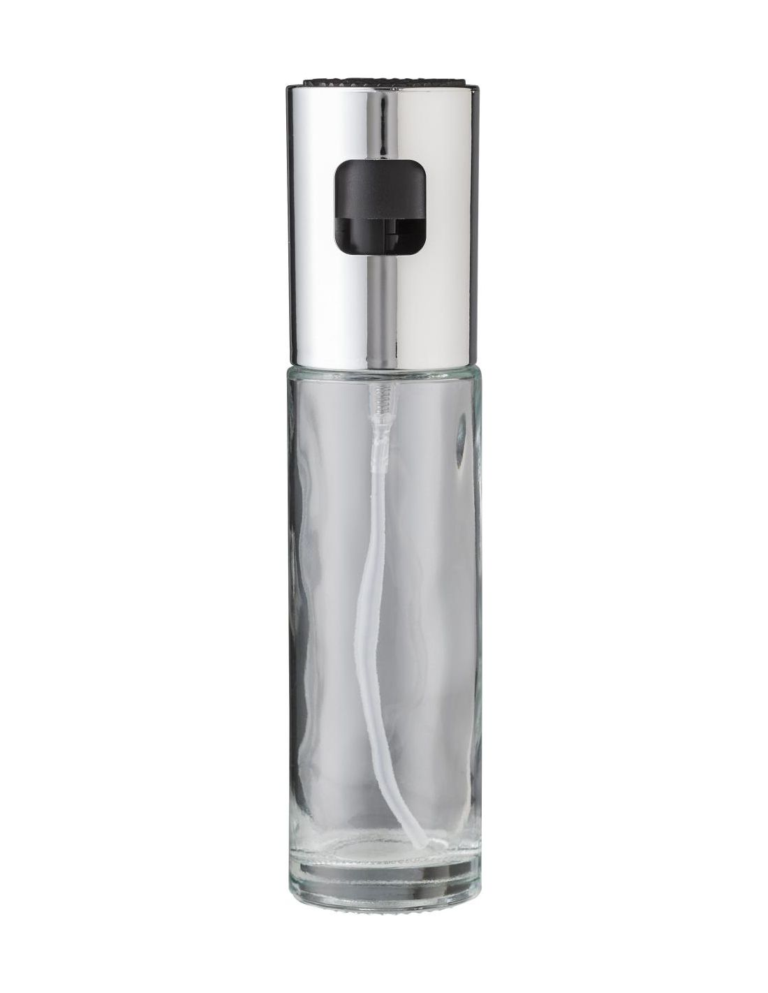 Dispensador de aceite en spray de vidrio (100 ml) con tapón de plástico cromado. Presentado en una caja de cartón marrón.