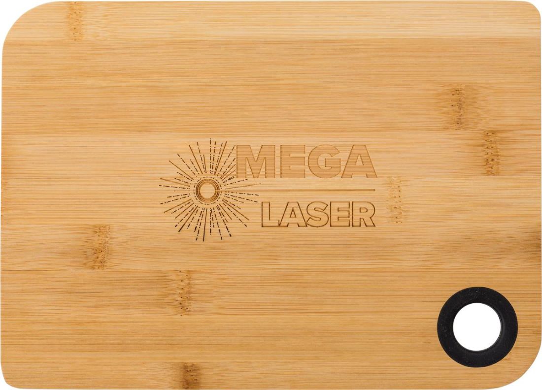 Tabla de bambú para cortar o servir. El orificio para sujetarla está recubierto con un anillo de silicona.