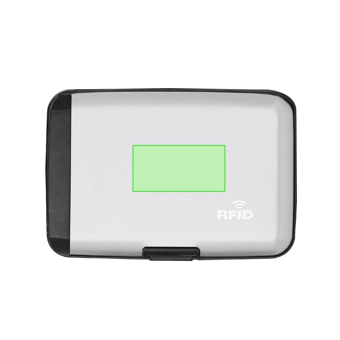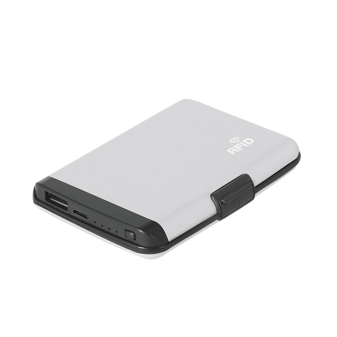 Tarjetero PowerBank fabricado en elegante Aluminio. Con 5 compartimentos, cierre de seguridad y sistema de protección RFID, diseñado para bloquear accesos no autorizados a tarjetas contactless. Cuenta con funcionalidad de batería auxiliar con capacidad de 2000 mAh. Salida y entrada en tipo C, cable incluido. Incluye distintivo logotipo RFID.