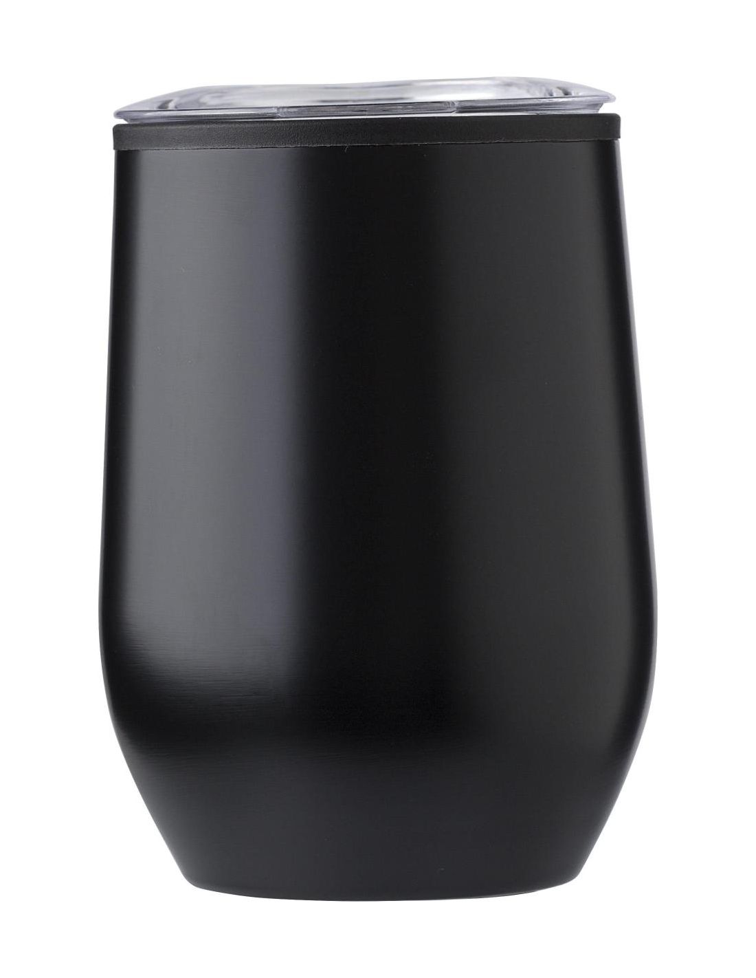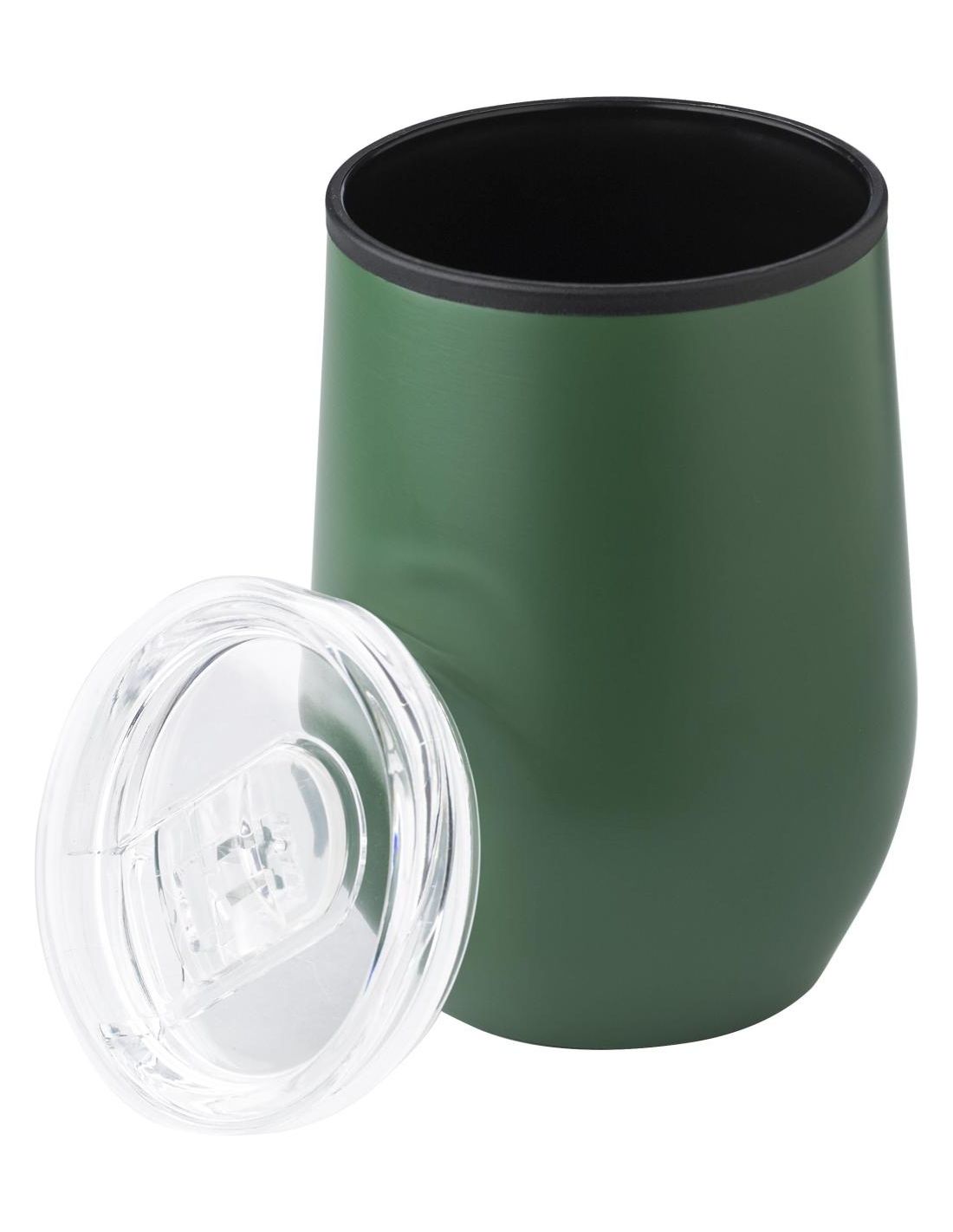 Vaso de acero inoxidable mate (300 ml) con interior de PP y tapa de PS. Presentado en una caja de cartón marrón.
