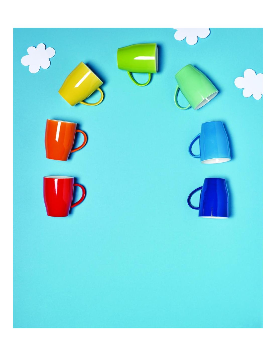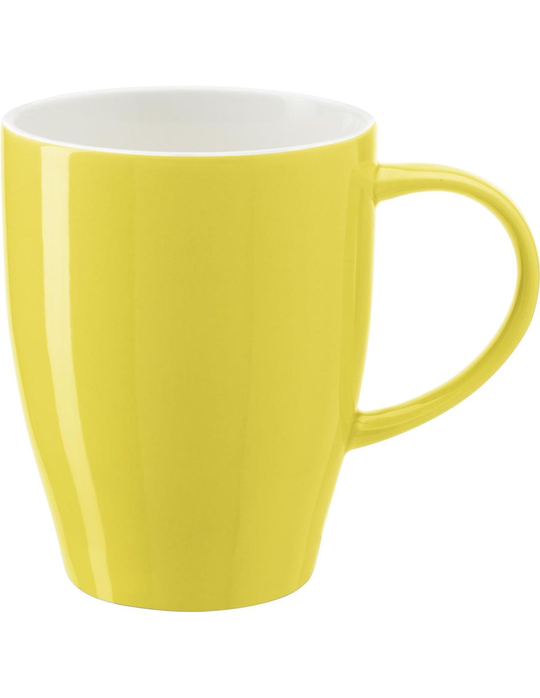 Taza de porcelana (350 ml) con colores opacos. Venta en múltiplos de 48 unidades, precio por unidad. Presentado en una caja de regalo.