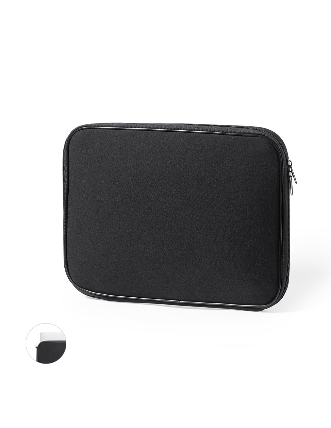 Funda para ordenador portátil, fabricada en resistente soft shell. En elegante color negro, con interior acolchado. Cierre de cremallera a juego con doble tirador. Para ordenador portátil o tablet de hasta 15 pulgadas.