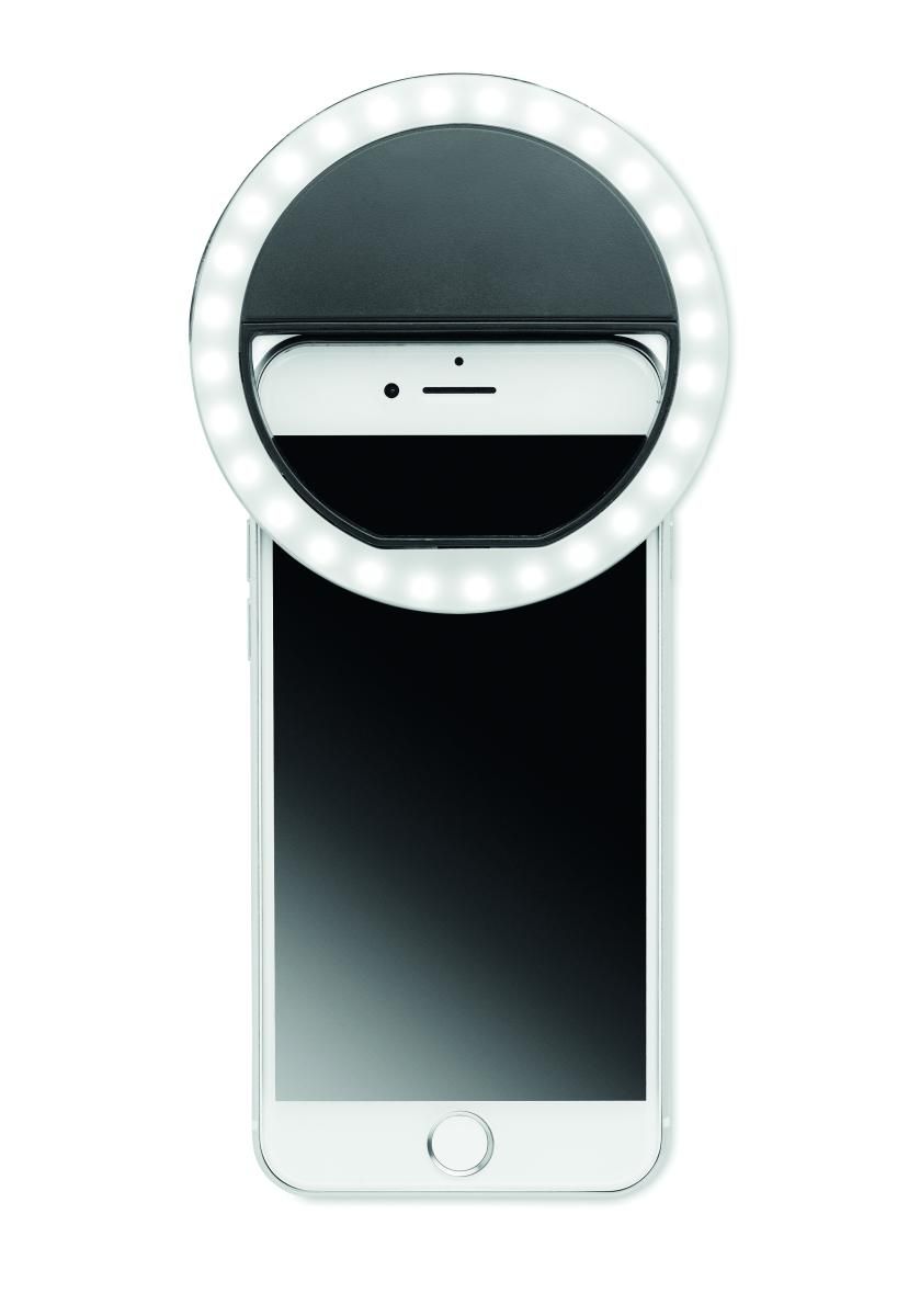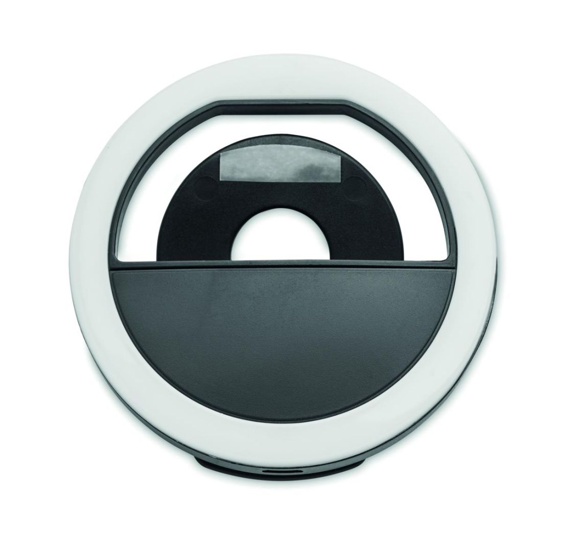 Anillo de luz con 28 LED para selfies, fabricado en ABS de 8 cm de diámetro. Luz blanca ajustable con 3 niveles de brillo diferentes. Batería de 80 mAh recargable a través de cable micro-USB suministrado.