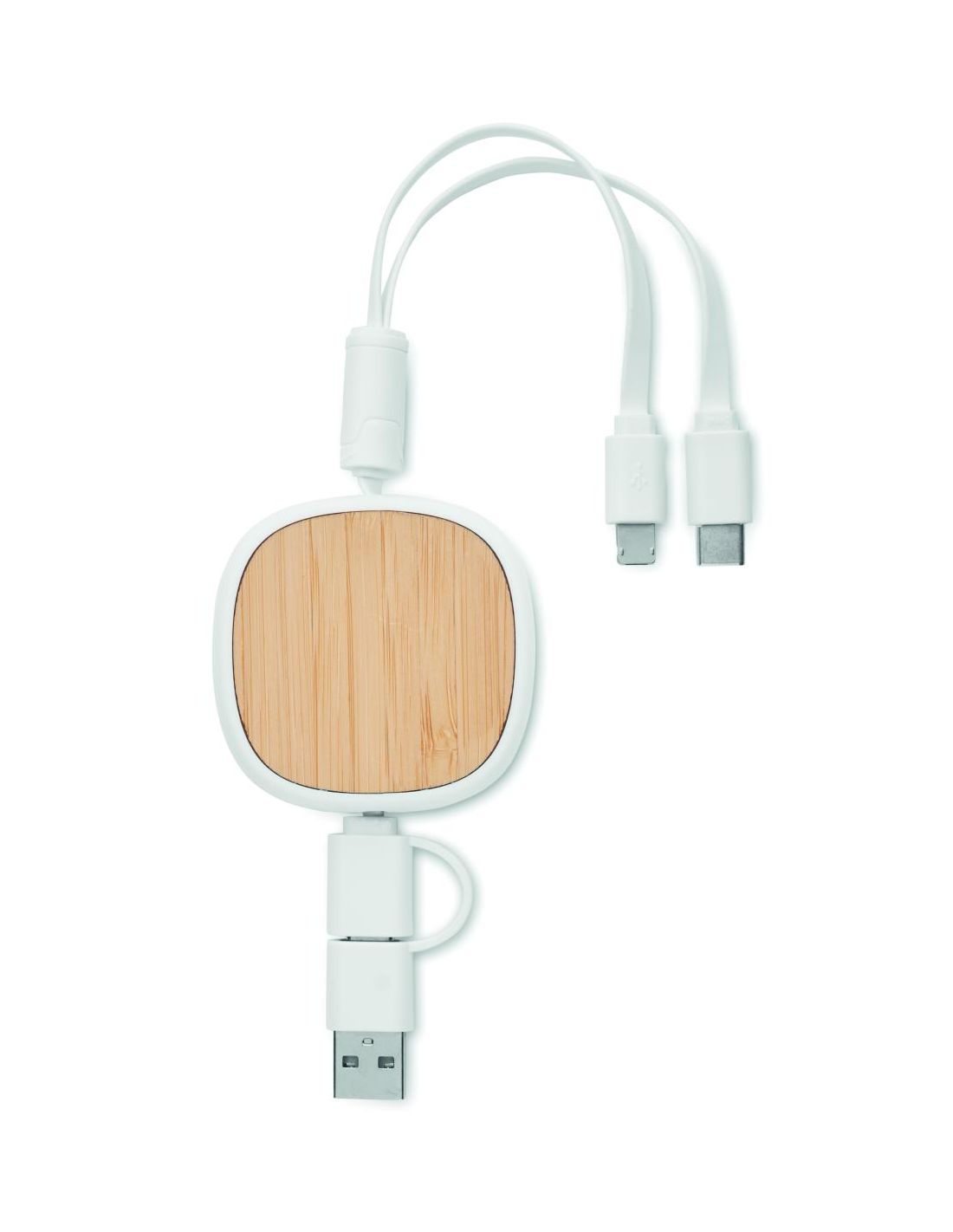 Cable de carga retráctil multiUSB en ABS con detalle de bambú en la parte superior. Entrada: 2 en 1 Tipo-C y Tipo-A. Salida: Tipo-C y 2 en 1 Tipo-B y conector. Longitud del cable: 90 cm.