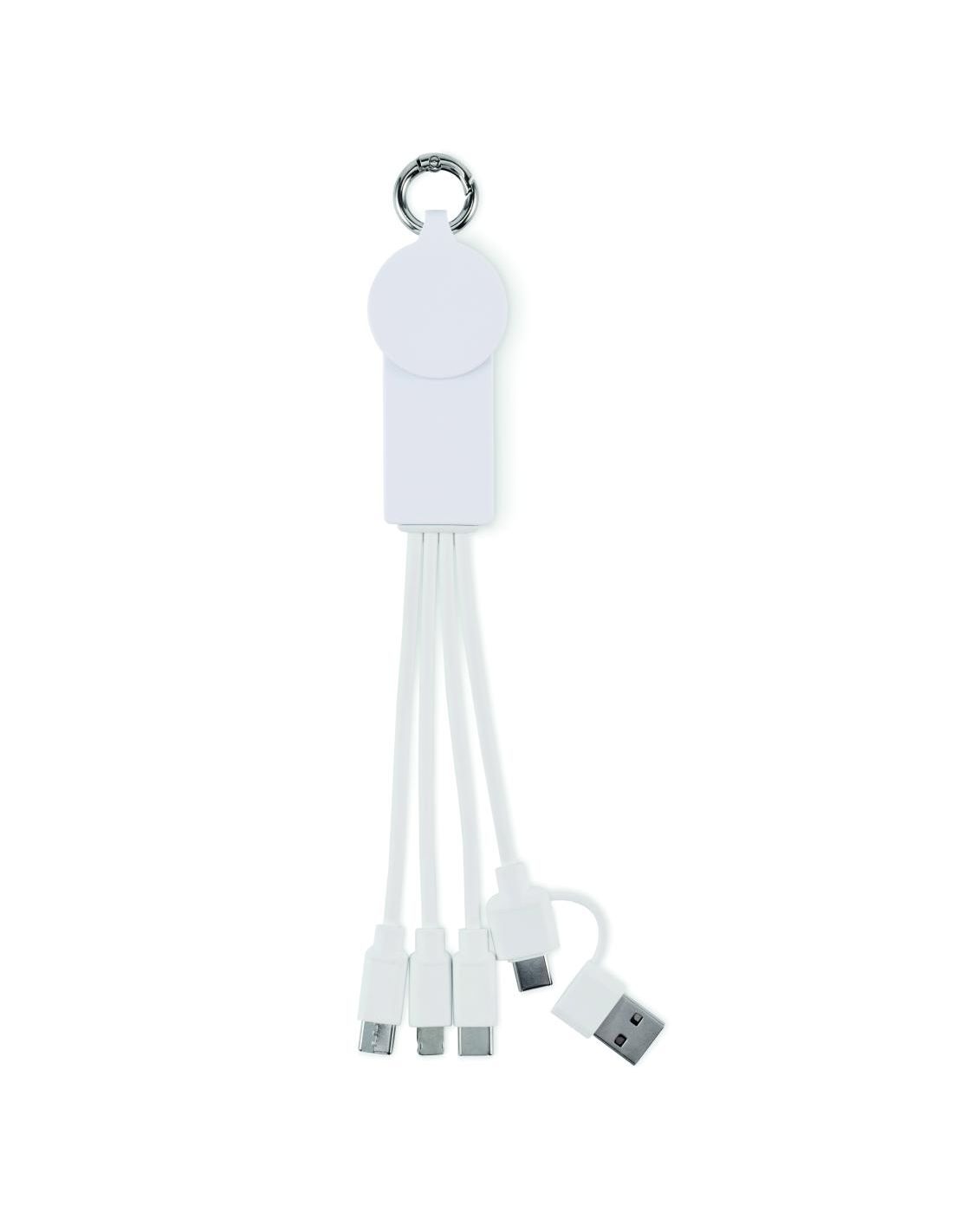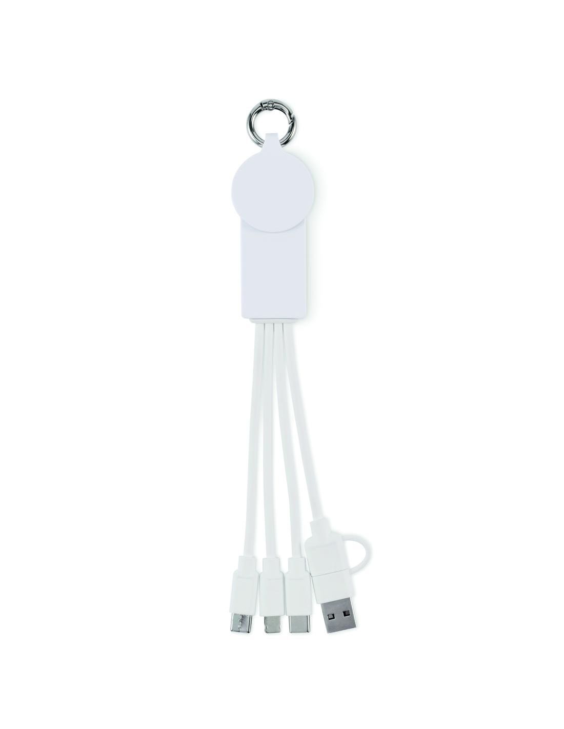 Llavero con cable de carga con entrada: 2 en 1 tipo-C y tipo-A. Salida: Carga de reloj (Samsung® y Apple®), 2 x tipo-C y micro-B (2 en 1 clavija). Cable de TPE reciclado.