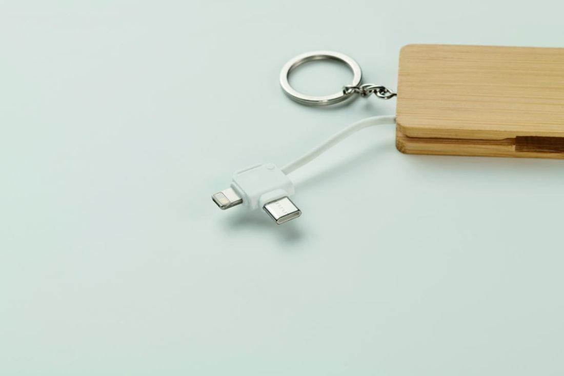 Llavero con carcasa de bambú y cables de carga. Entrada: 2 en 1 Tipo-C y Tipo-A. Salida: Tipo-C y micro-B (2 en 1 pin).