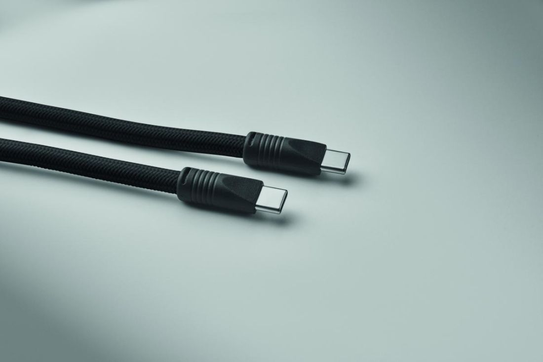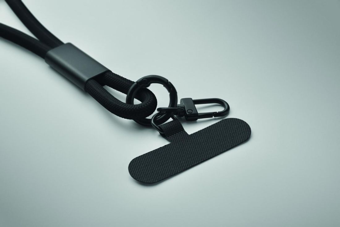 Lanyard con cable de carga y transferencia de datos de 60 W de tipo C a tipo C en RPET con soporte para cable de teléfono y clip para llaves.