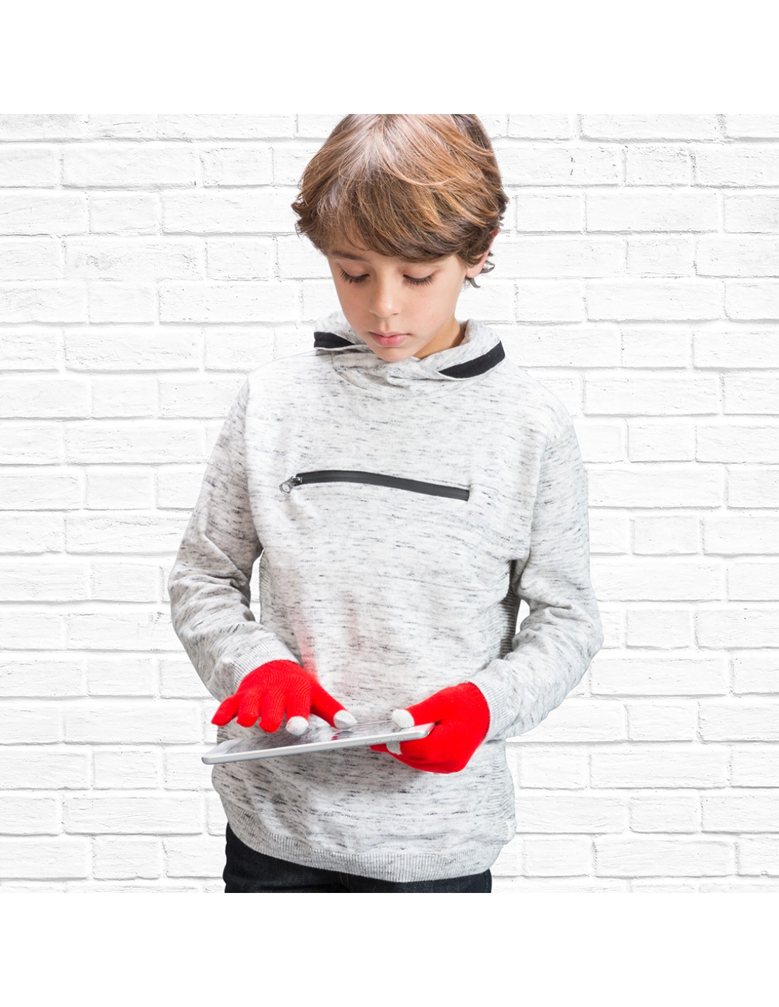 Práctico par de guantes de niño para dispositivos con pantalla táctil, de suave acabalado acrílico y en divertidos colores. Integran puntero en dedos corazón, índice y pulgar. Talla única.